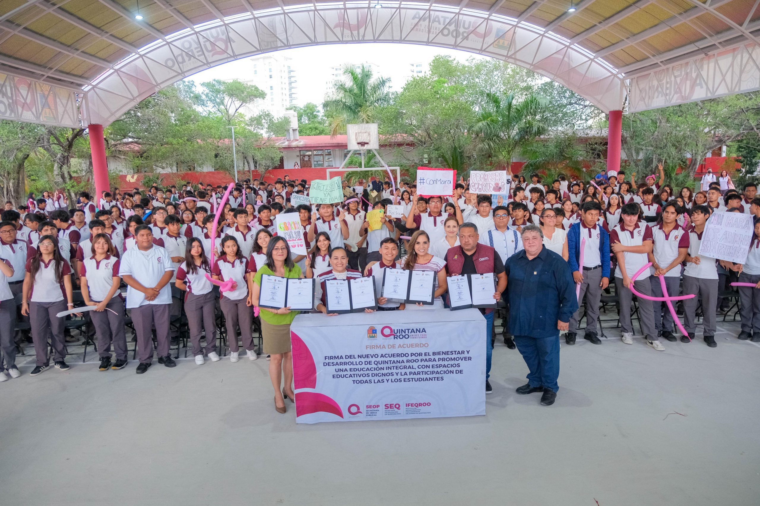 En el marco de este evento, la gobernadora Mara Lezama encabezó la firma del Nuevo Acuerdo por el Bienestar y Desarrollo de Quintana Roo, con el objetivo de promover una educación integral, garantizar espacios educativos dignos y fomentar la participación activa de toda la comunidad estudiantil.