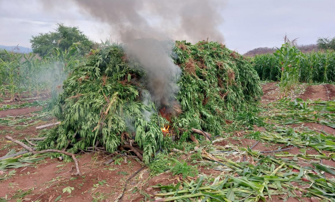 Elementos de la PFM, el Ejército Mexicano y Guardia Nacional acudieron al sitio donde encontraron “un área abierta con superficie de mil 860 metros cuadrados”, en donde estimaron 20 mil plantas de marihuana que fueron destruidas mediante incineración.