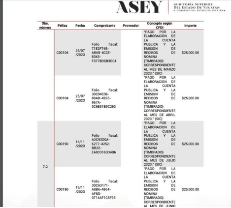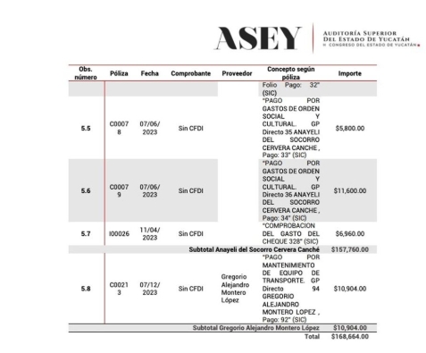 Entre las observaciones más relevantes, la ASEY señaló pagos por $175,000.00 en 2023 bajo el concepto de “Servicios legales, de contabilidad, auditoría y servicios relacionados”.
