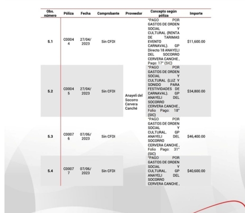 De igual forma, se detectaron pagos por $168,664.00 en 2024 por “Gastos de orden social y cultural”, los cuales, según los estados de cuenta, fueron ingresados, pero después registrados como “Cancelado”.