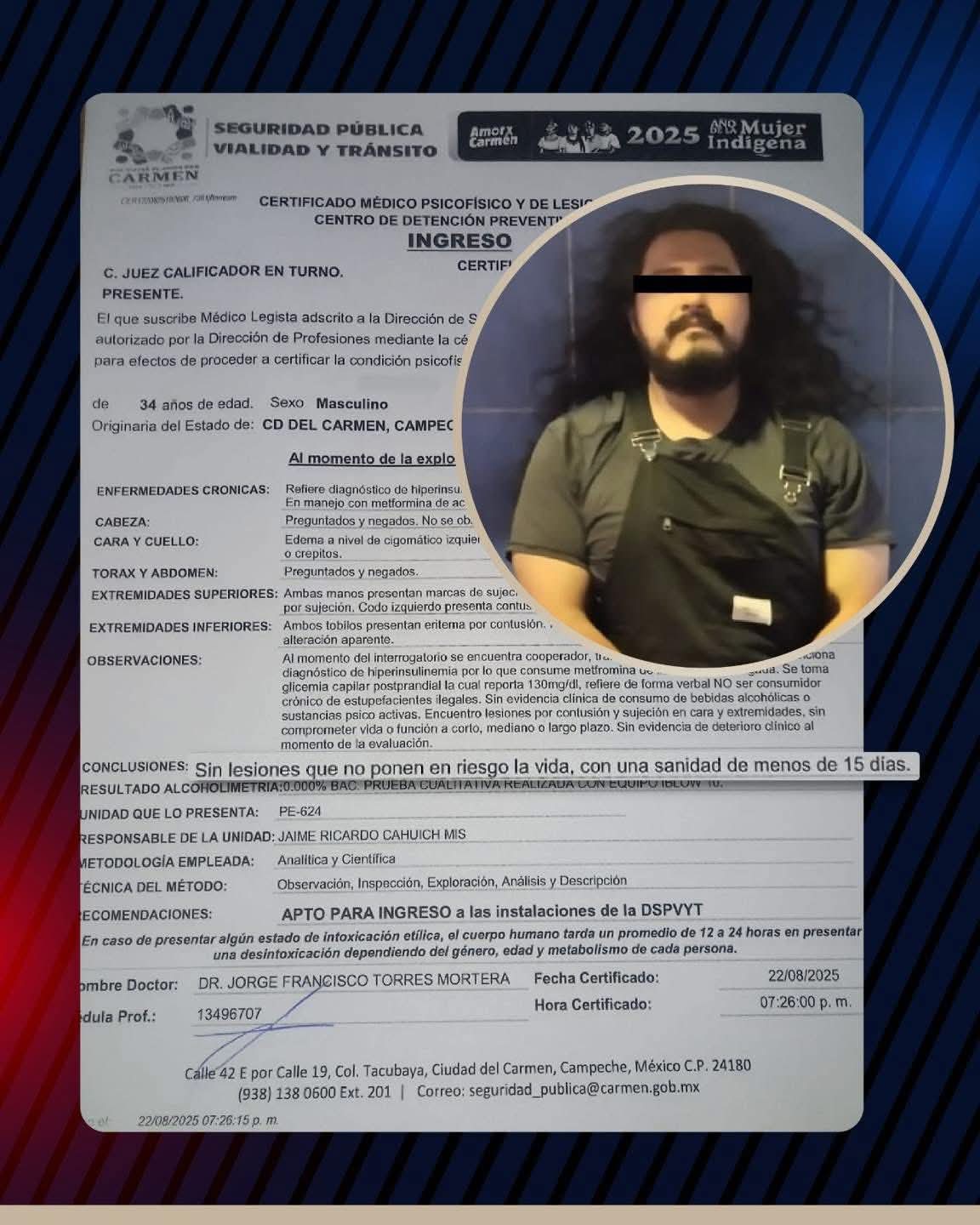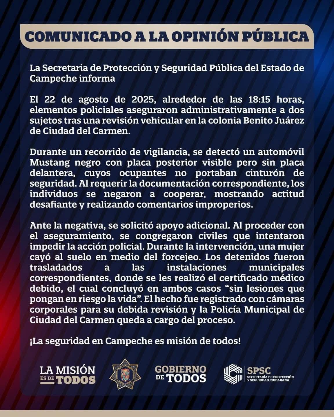 “Ante la negativa, se solicitó apoyo adicional. Al proceder con el aseguramiento, se congregaron civiles que intentaron impedir la acción policial. Durante la intervención, una mujer cayó al suelo en medio del forcejeo. Los detenidos fueron trasladado a las instalaciones municipales correspondientes, donde se les realizó el certificado médico debido, el cual concluyó en ambos casos “sin lesiones que pongan en riesgo la vida”. El hecho fue registrado con cámaras corporales para su debida revisión y la Policía Municipal de Ciudad del Carmen queda a cargo del proceso”, agregó la SPSC.
