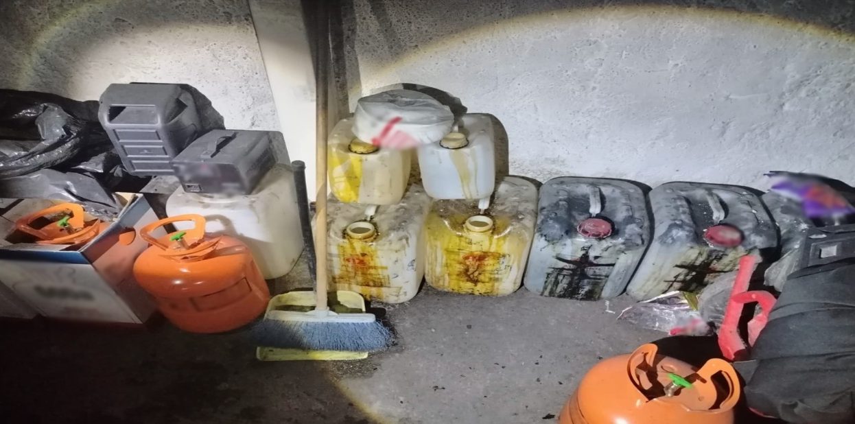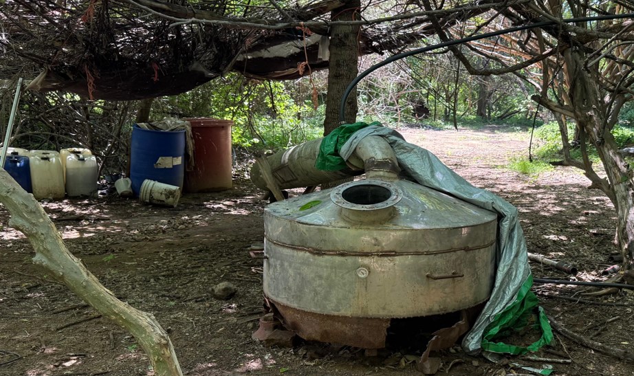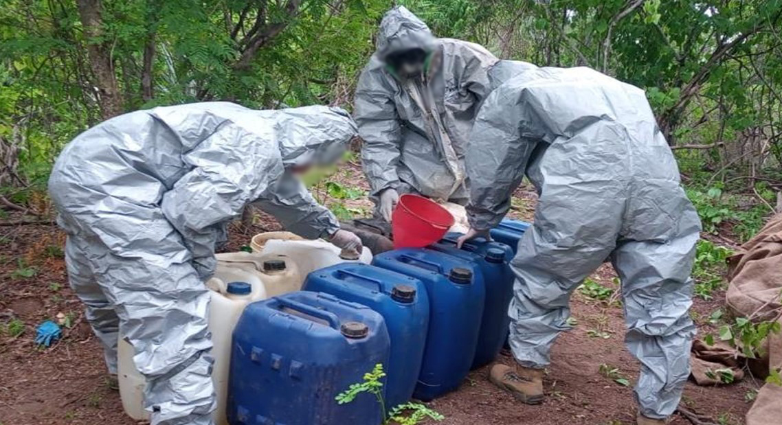 En San Pedro Tlaquepaque, Jalisco, elementos del Ejército Mexicano y Policía Municipal localizaron un área de concentración de material diverso para la elaboración de droga sintética, aseguraron 300 kilos de marihuana y 200 litros de sustancias químicas.