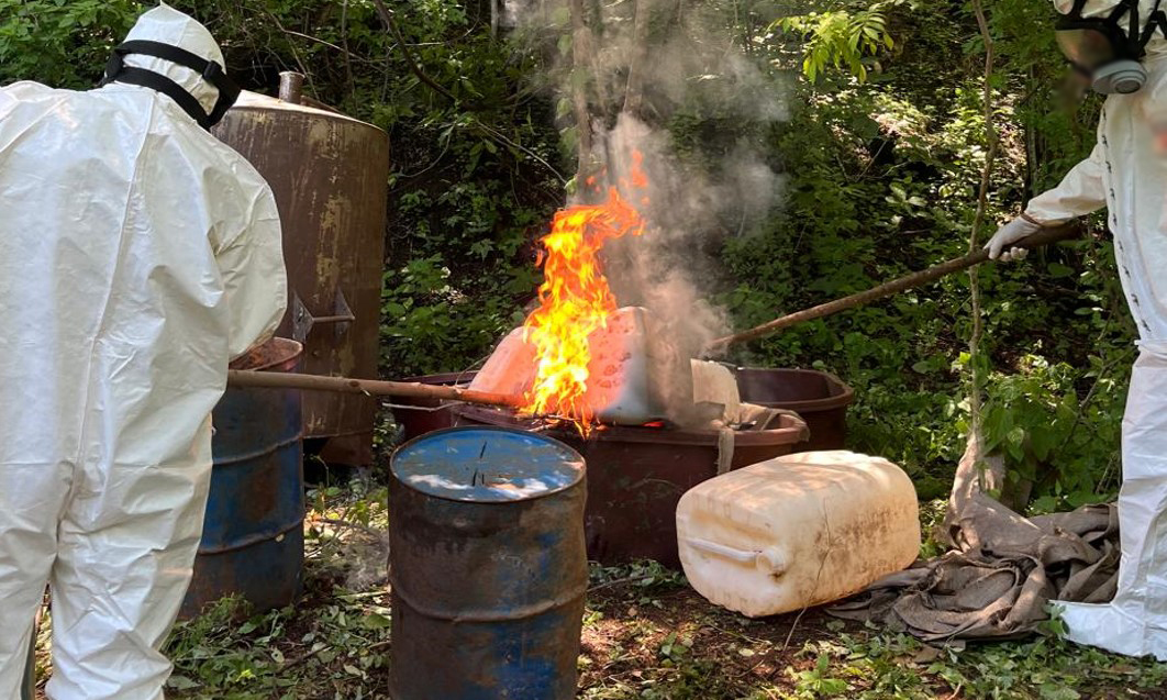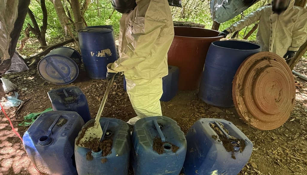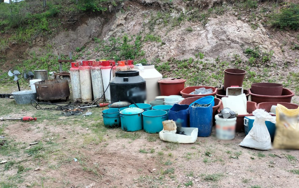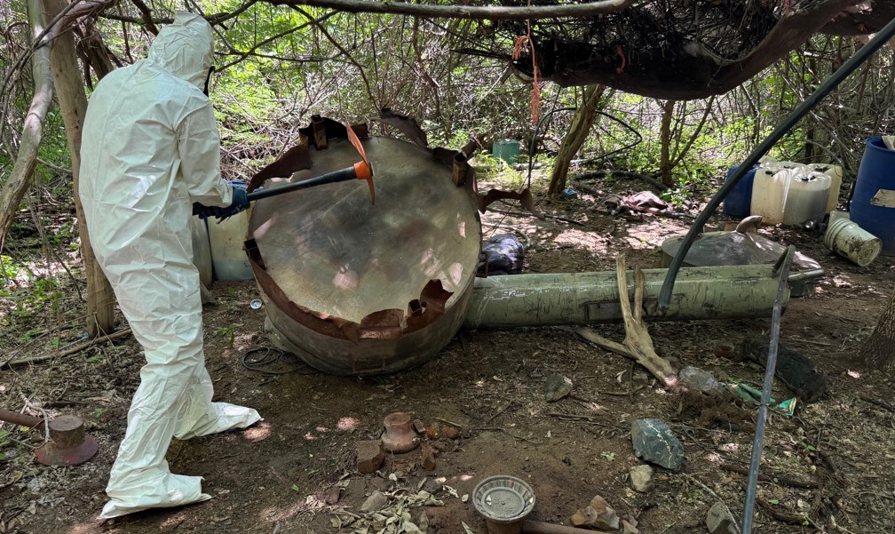 En Culiacán y Tamazula, Sinaloa, en los poblados El Guayabito, El Limón de Tellaeche, Los Vasitos, El Carrizal, Estancia de los García, Presa Vinoramas, El Limoncito y en San José de Chiqueritos, en Durango, elementos del Ejército Mexicano localizaron ocho áreas de concentración de material diverso para la elaboración de metanfetamina, aseguraron 9,430 litros y 150 kilos de sustancias químicas, cuatro reactores de síntesis orgánica y dos condensadores.