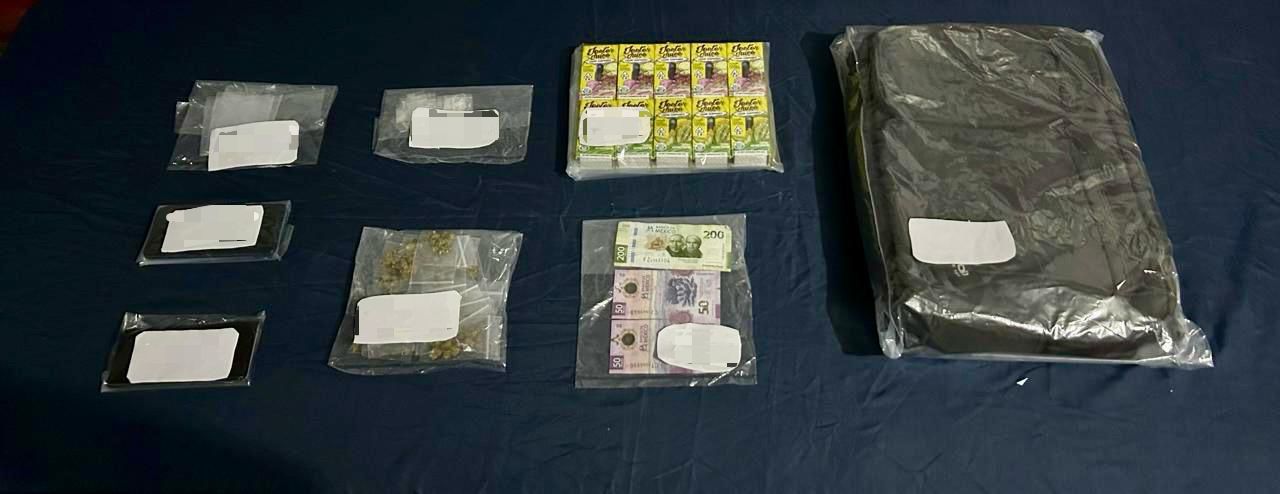 Tras la inspección, las autoridades aseguraron 18 bolsitas con marihuana, 14 bolsitas con cristal, 10 cajas de cigarros electrónicos tipo vape que contenían líquido con características similares a la marihuana, 300 pesos mexicanos en efectivo, una mochila, dos teléfonos celulares, y también aseguraron el vehículo marca Volkswagen, tipo Jetta, modelo 2004, de color gris, con placas de circulación del Estado de México.