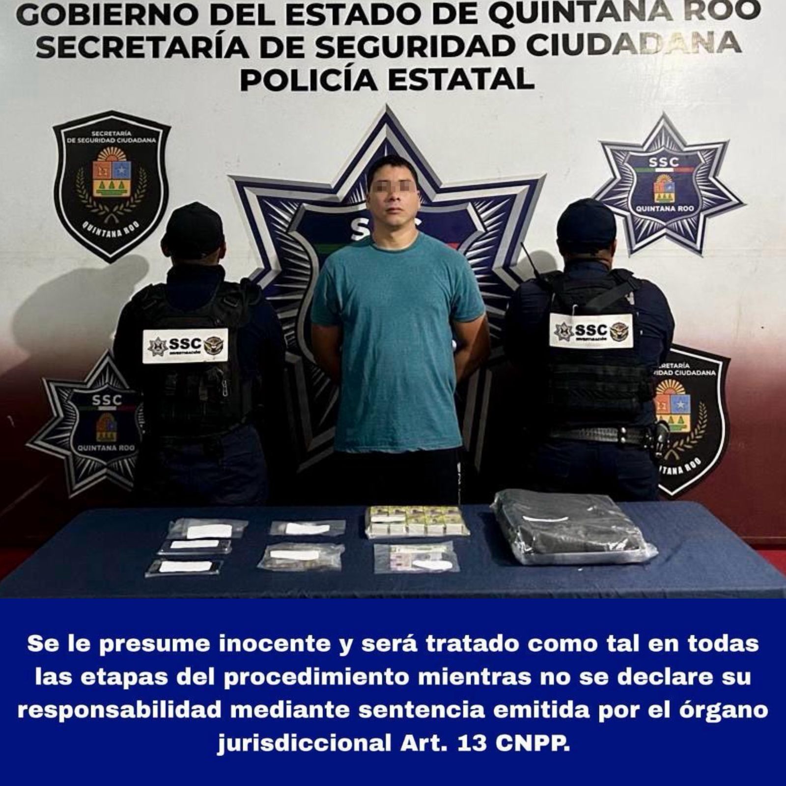Cancún, 9 de diciembre. — Una persona identificada como Jorge Luis “N” fue detenida por su presunta implicación en delitos Contra la Salud, tras ser sorprendido en plena transacción de narcóticos en el fraccionamiento Prado Norte.