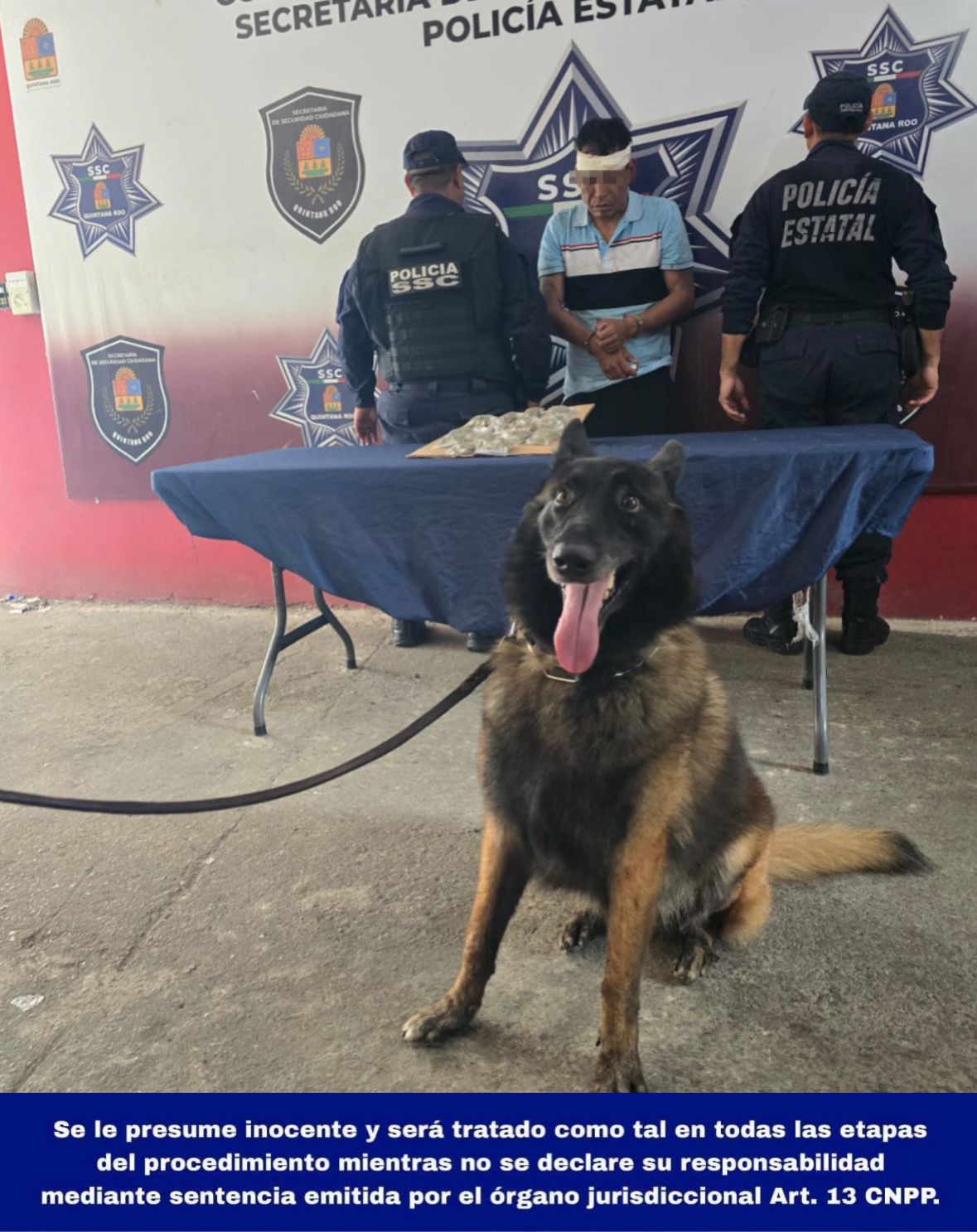 Cancún, 1 de octubre.- Elementos del Grupo K9 de la Secretaría de Seguridad Ciudadana, lograron la detención de un hombre identificado como Víctor Hugo “N” en el municipio de Benito Juárez, por su presunta implicación en delitos Contra la Salud (narcomenudeo), luego de que un canino especializado alertara a los agentes.