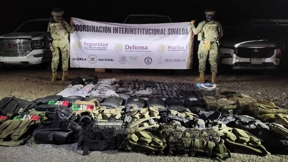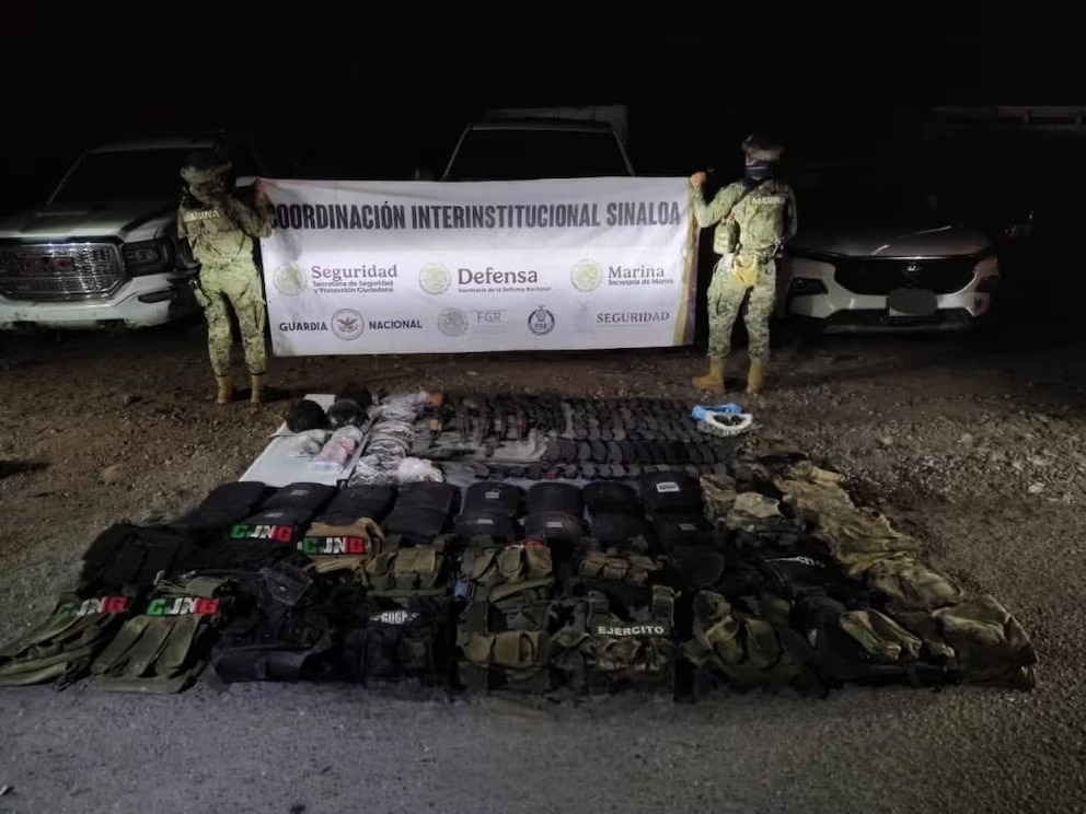 Durante el operativo se localizó arsenal que consistía en 6 fusiles AK-47, una pistola de 9 mm, 1 fusil calibre 7.62, 65 cargadores y más de mil cartuchos de diversos calibres. Asimismo, se hallaron 16 chalecos tácticos, 16 pares de placas balísticas, 3 cascos balísticos, 2 pierneras y 9 conjuntos de ropa táctica.