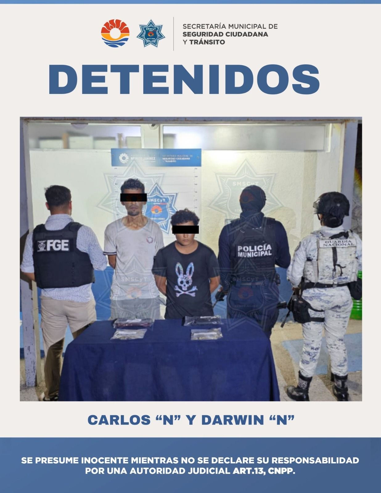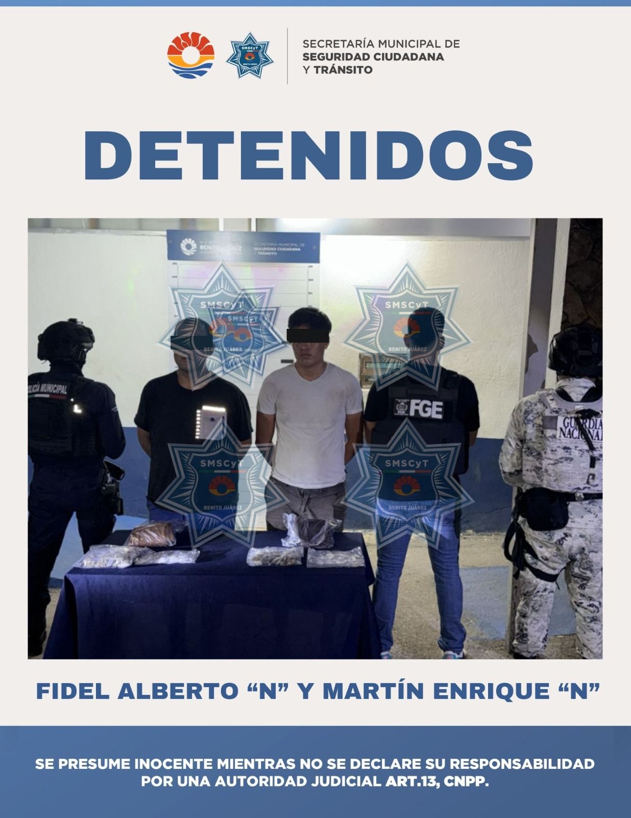 La Secretaría Municipal de Seguridad Ciudadana y Tránsito de Benito Juárez informó que en una primera intervención, elementos de la Guardia Nacional y de la Secretaría Municipal de Seguridad Ciudadana y Tránsito (SMSCyT) detuvieron en la Supermanzana 248 a Carlos “N”, de 25 años, y Darwin “N”, de 24, cuando fueron sorprendidos intercambiando lo que parecían ser narcóticos.