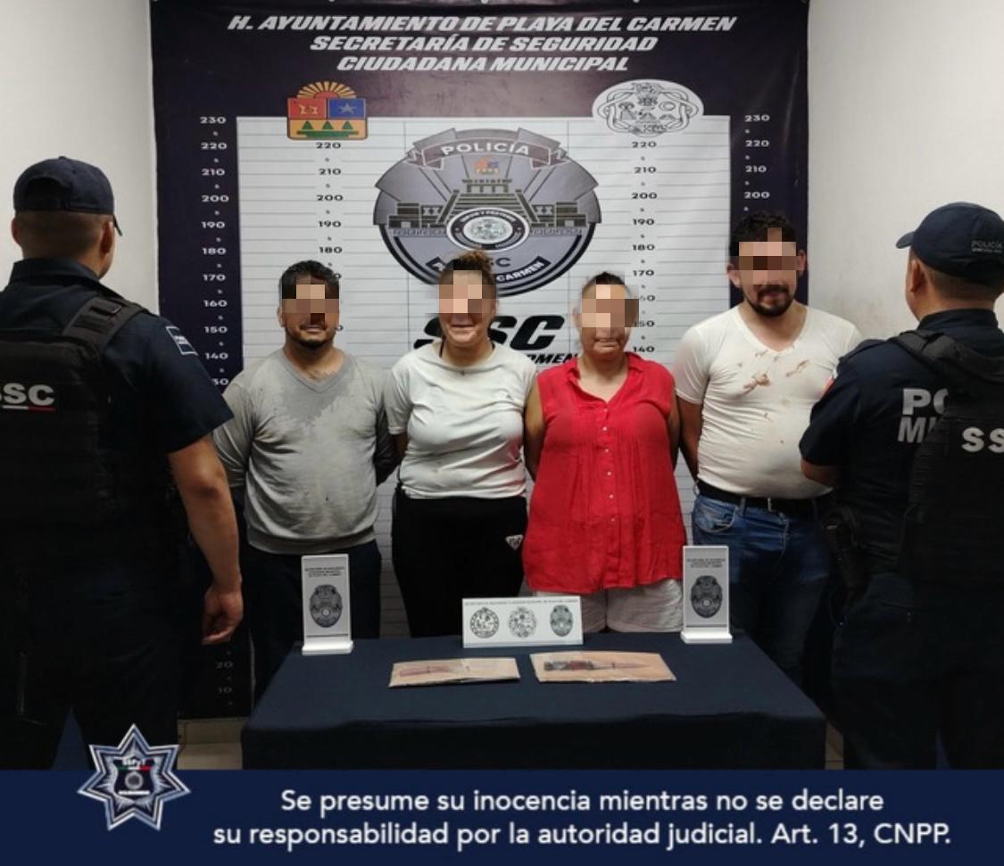 Playa del Carmen, a 27 de mayo de 2025.- La Secretaría de Seguridad Ciudadana de Playa del Carmen detuvo a cuatro personas por la probable comisión del delito de lesiones en el fraccionamiento Real Bilbao. Policías municipales atendieron un reporte al 9-1-1 sobre una riña en la calle Paseo Bilbao, donde un hombre denunció haber sido agredido por varios individuos, entre ellos una mujer que presuntamente lo lesionó con un cuchillo. En el lugar se aseguraron dos cuchillos y una camioneta tipo van. Se desconoce el motivos que d la riña.