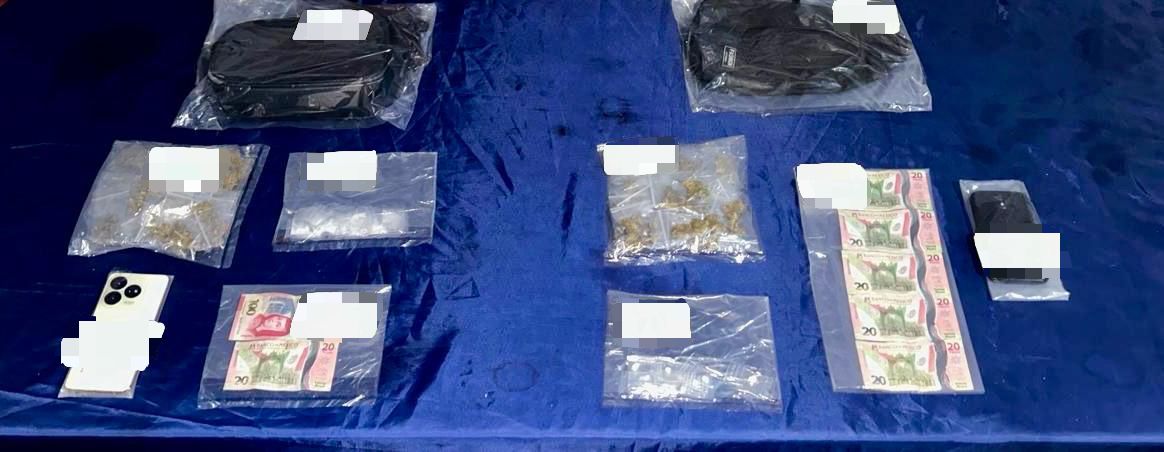 Además de los estupefacientes, se les decomisaron dos teléfonos celulares, dos mariconeras y dinero en efectivo en billetes de diversas denominaciones.