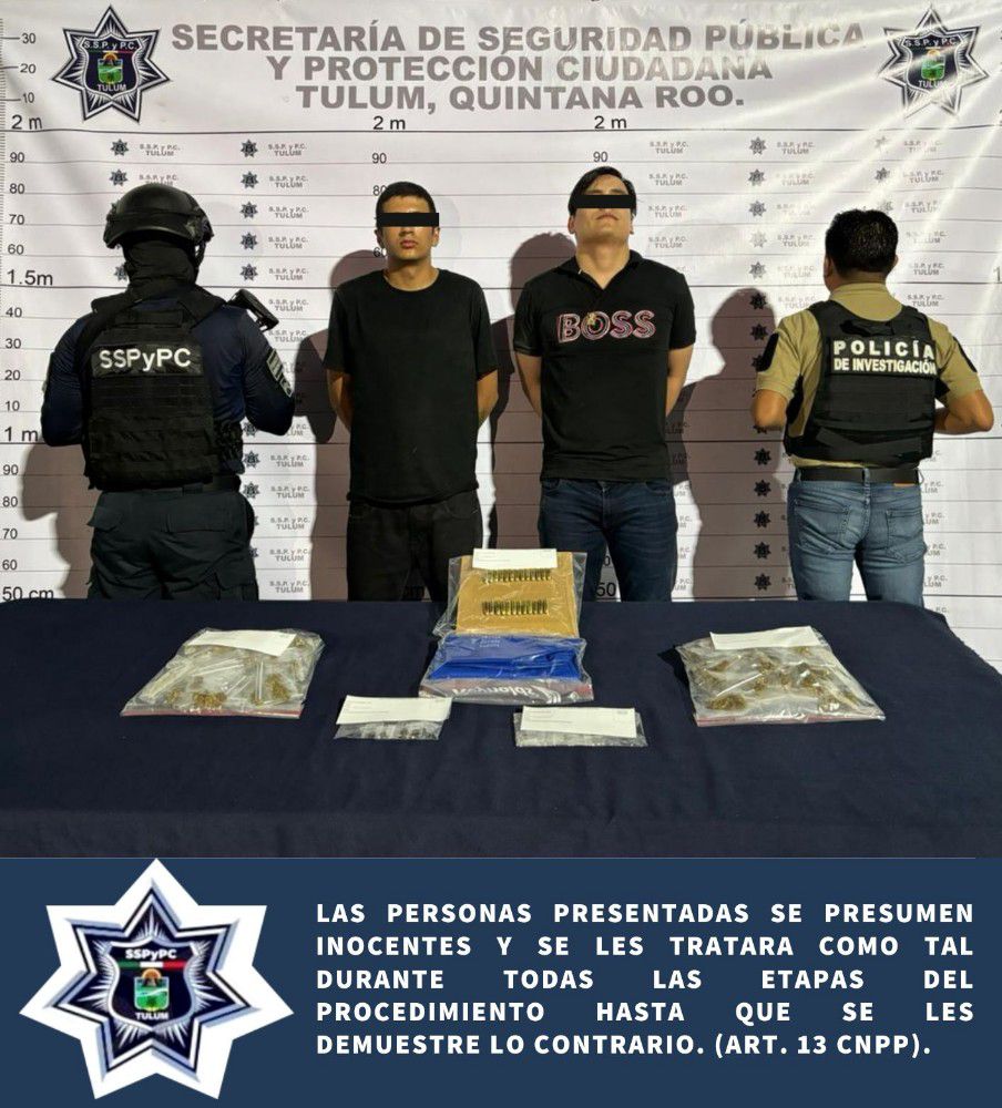 TULUM a 20 de septiembre.– Dos hombres originarios del estado de Sinaloa fueron detenidos en Tulum durante un operativo en el que se aseguraron diversas dosis de droga y cartuchos útiles. La detención estuvo a cargo de elementos de la Secretaría de Seguridad Pública y Protección Ciudadana de Tulum, en coordinación con agentes de la Fiscalía General del Estado.