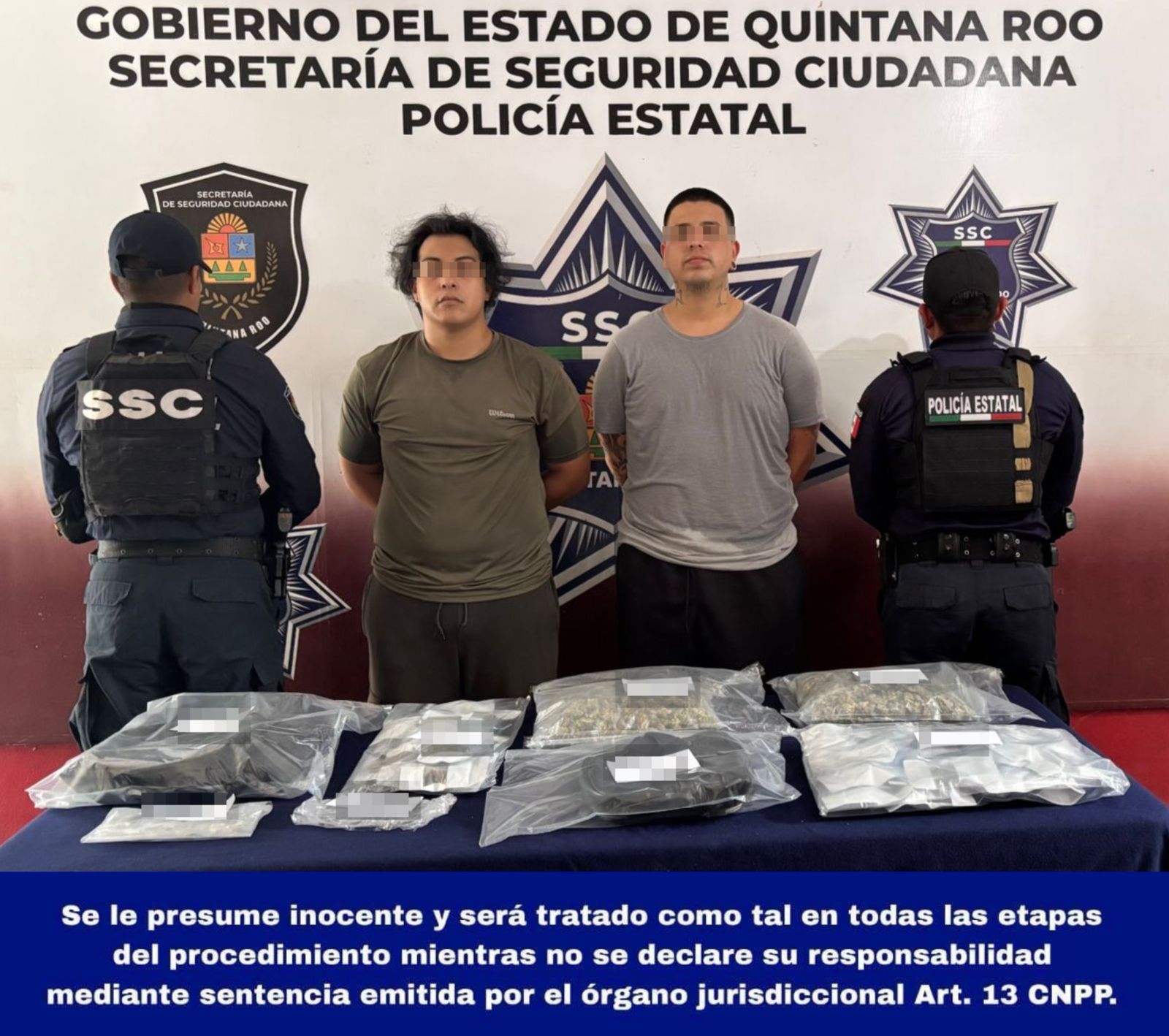 Cancún, 14 de agosto.- La Policía Estatal de la Secretaría de Seguridad Ciudadana detuvo a Sebastián “N” y Alexis “N”, presuntos implicados en delitos contra la salud, tras un operativo de vigilancia en la supermanzana 95 de Benito Juárez.