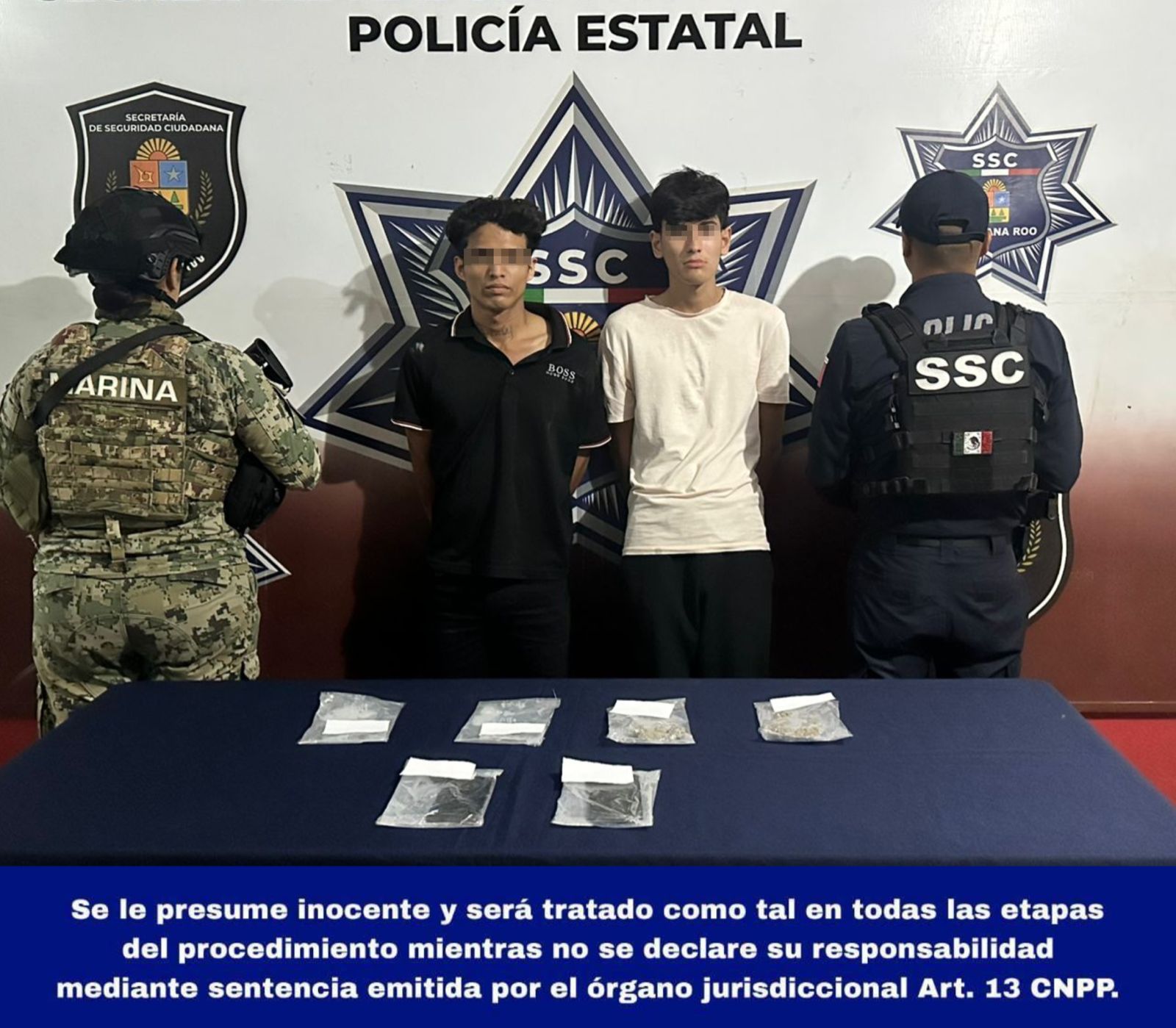 Cancún, 17 de diciembre.- Autoridades estatales detuvieron en la supermanzana 216 de Cancún a dos hombres identificados como Brian N alias “Marin” y José Alberto N, alias “Miclo”, quienes son señalados por su presunta participación en delitos contra la salud.