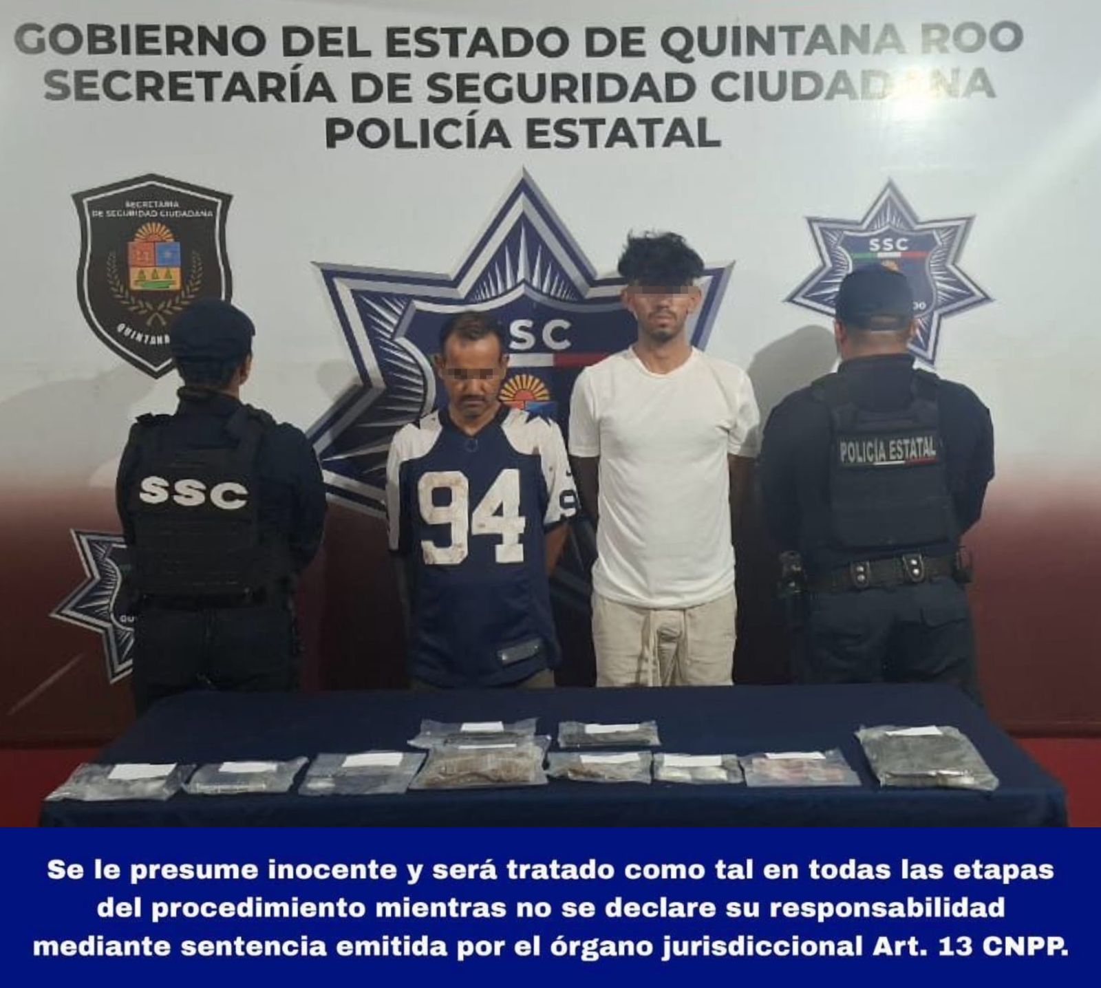 Cancún, 16 de mayo. – Dos hombres fueron detenidos por elementos de la Secretaría de Seguridad Ciudadana, tras ser sorprendidos en posesión de drogas y una motocicleta con reporte de robo, en calles del fraccionamiento Los Ángeles.