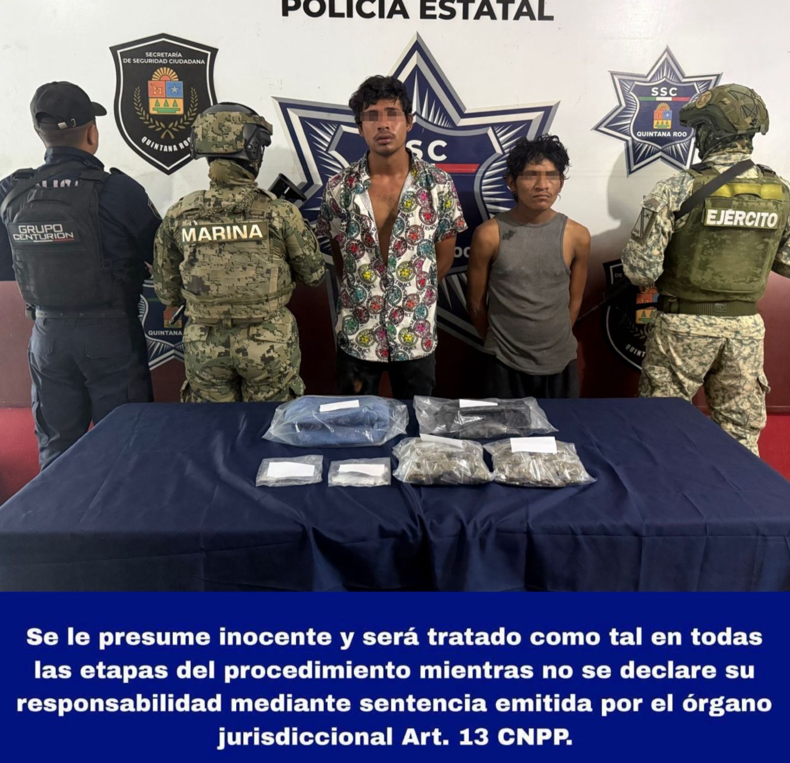 Cancún, 21 de noviembre.- Elementos del Grupo Centurión de la Secretaría de Seguridad Ciudadana, en coordinación con personal de la Secretaría de Marina, detuvieron a José Manuel “N” y Raymundo “N” por su presunta implicación en delitos Contra la Salud.