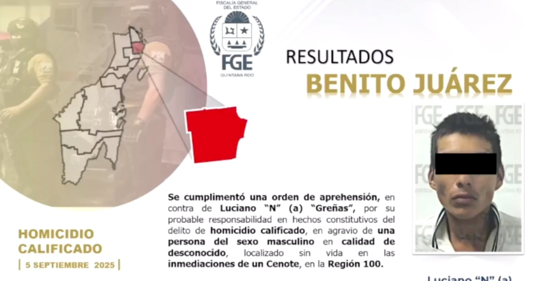 Cancún, 8 de septiembre.– Agentes de la Policía de Investigación capturaron a Luciano “N”, alias “El Greñas”, de 20 años y originario de Tabasco, acusado de homicidio calificado en contra de un hombre cuyo cuerpo fue hallado en un cenote de la supermanzana 100.