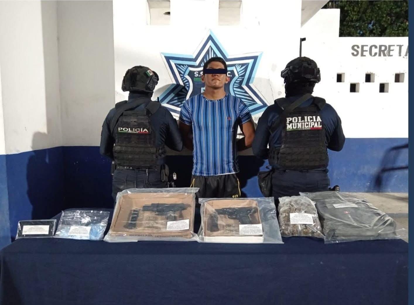El detenido fue identificado como Adrián Alfredo “N”, de 26 años, originario de Las Choapas, Veracruz. Según el reporte oficial, durante la intervención se le aseguraron dos armas de fuego calibre .380, 89 bolsitas que contenían hierba seca con características similares a la marihuana y 87 bolsitas con polvo blanco presuntamente cristal.