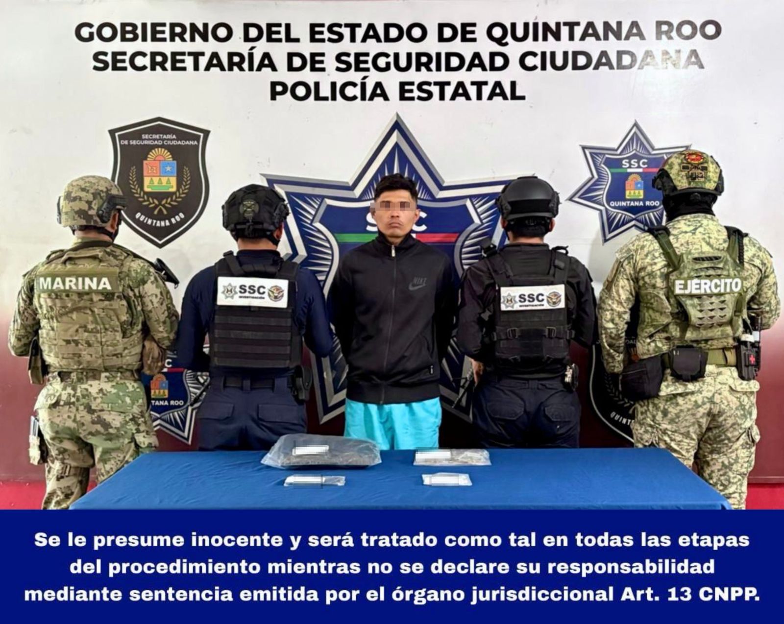 Cancún, 6 de febrero. – Como resultado de los operativos de vigilancia realizados por el Grupo de Investigación de la Secretaría de Seguridad Ciudadana, en conjunto con la Marina y el Ejército, un sujeto identificado como Diego Armando N, fue detenido tras asegurarle diversas sustancias ilícitas en el municipio de Benito Juárez.