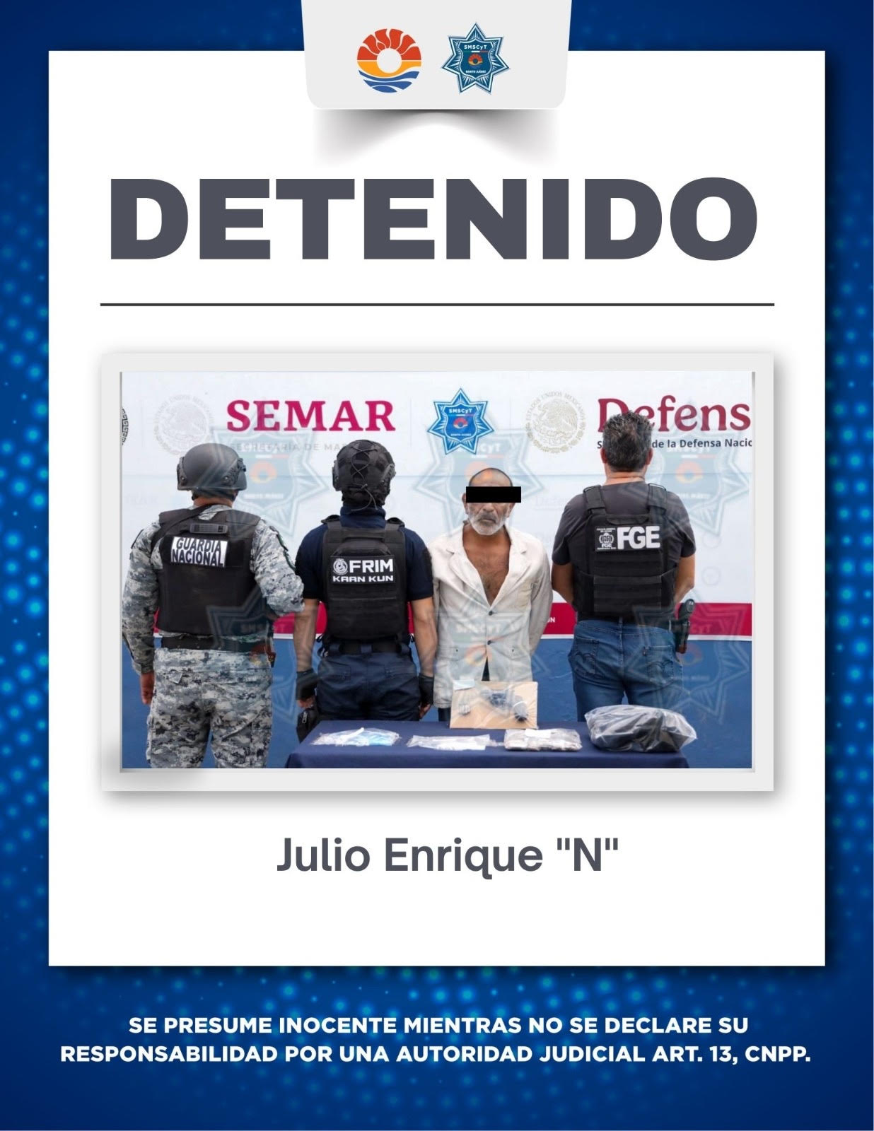 Cancún, 2 de febrero.- Como resultado de una acción coordinada entre la Guardia Nacional, la Fiscalía General del Estado y la Secretaría Municipal de Seguridad Ciudadana y Tránsito, se logró la captura de un hombre por su presunta participación en delitos contra la salud y portación de arma de fuego en Cancún.