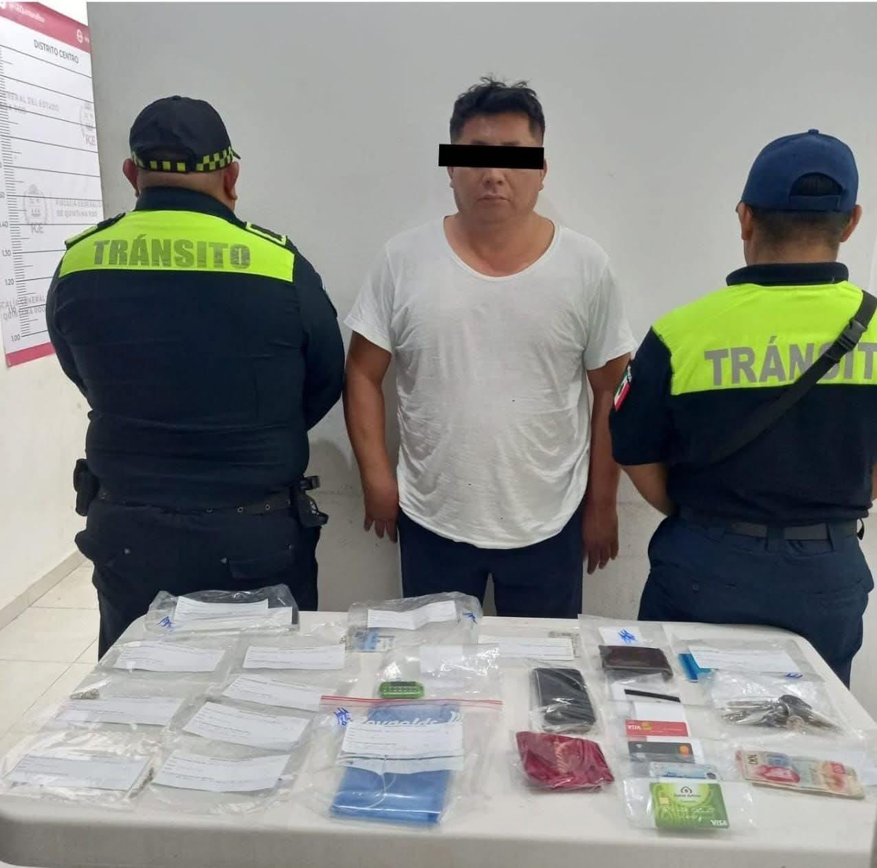TULUM a 17 de septiembre .– La rápida intervención de elementos de Tránsito permitió la detención de un hombre identificado como Pedro “N”, señalado por su presunta participación en un robo. El sujeto fue sorprendido en flagrancia cuando se encontraba en posesión de diversos artículos de valor y dinero en efectivo, cuya procedencia no pudo acreditar.