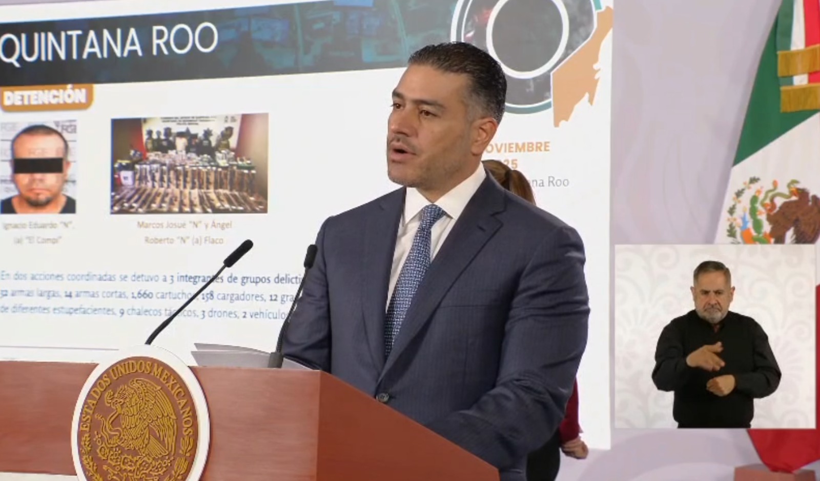 Omar García Harfuch, titular de la SSPC, informó que en coordinación con autoridades de Quintana Roo fueron detenidos tres integrantes de un grupo delictivo y se aseguraron 46 armas de fuego, mil 600 cartuchos, 158 cargadores, 12 granadas, droga, equipo táctico y drones. En otro operativo, fue capturado Emiliano Alejandro “N”, alias “El H”, jefe de plaza del CJNG y considerado objetivo prioritario en la entidad.
