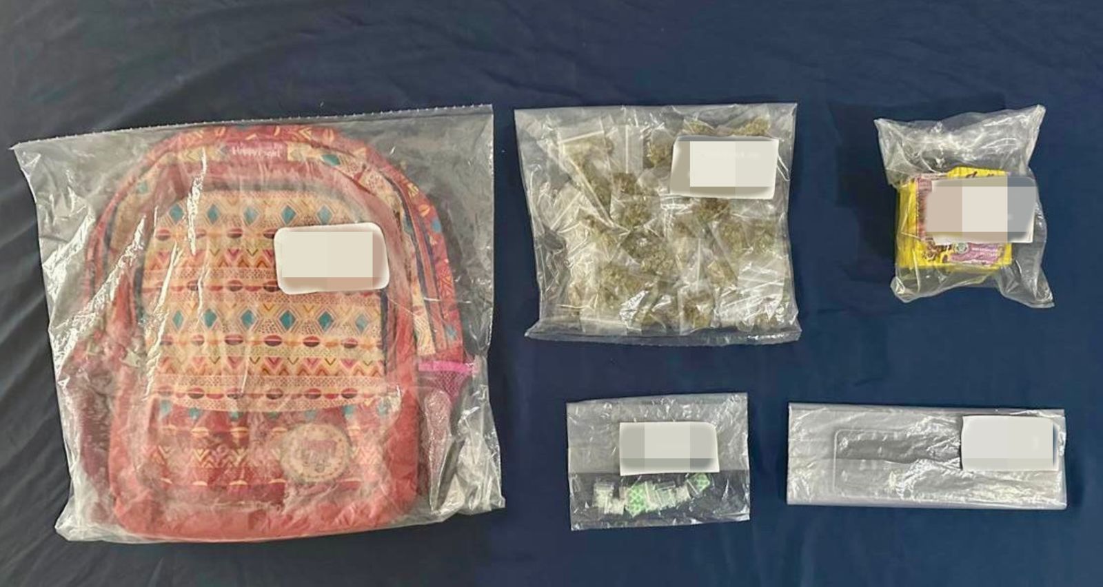 Tras la inspección correspondiente, al hombre se le decomisó la siguiente evidencia: 43 bolsitas con hierba verde y seca con características de marihuana, 13 bolsitas con fragmentos cristalinos similares a la droga conocida como cristal, cinco cajas con cartuchos de CBD, con características similares al cannabis, una mochila y un teléfono celular.