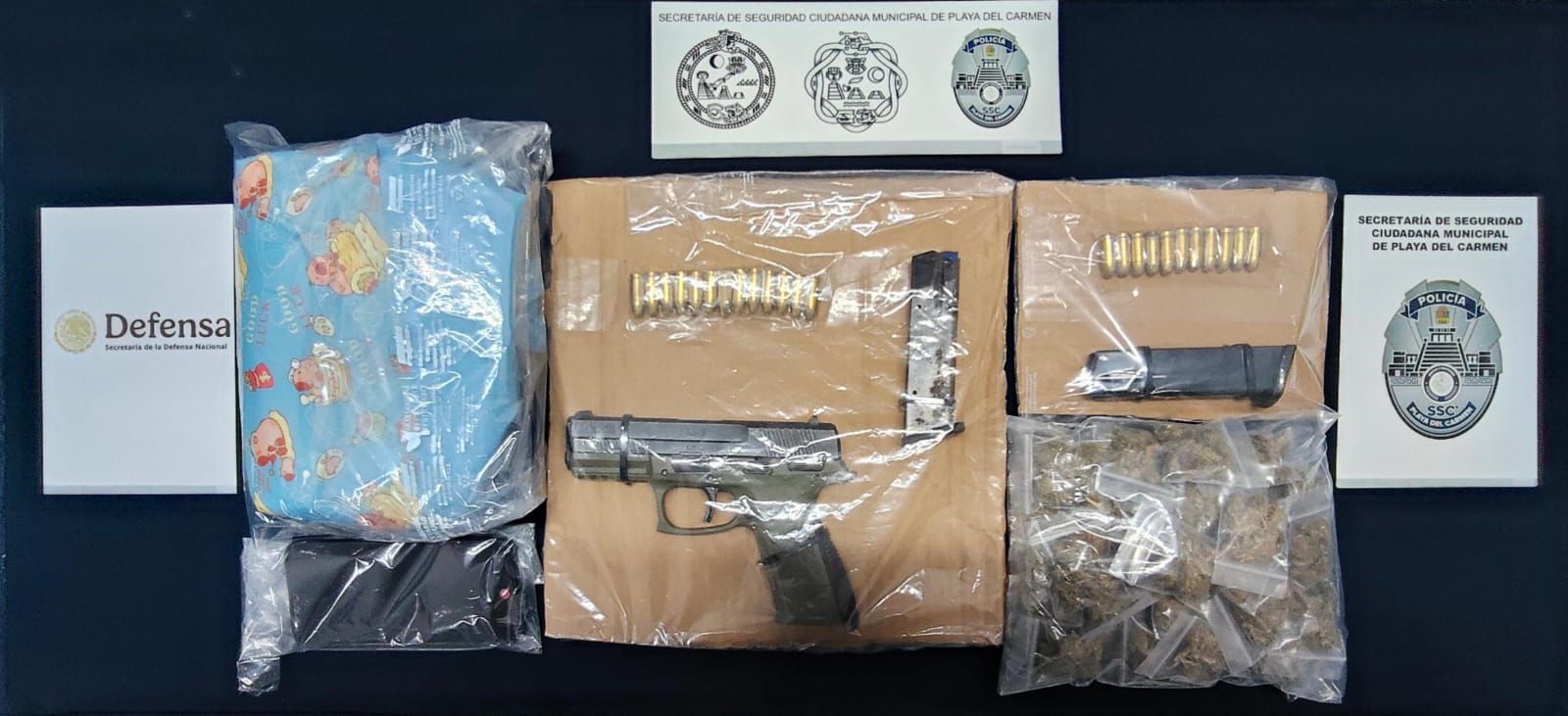 La detenida fue identificada como Jessica “N”, de 33 años y originaria de Quintana Roo, quien fue sorprendida mientras manipulaba envoltorios con características de narcóticos. Ante la conducta sospechosa, los elementos procedieron a una inspección en la que le fueron aseguradas varias bolsitas con vegetal verde con apariencia de marihuana, un arma de fuego, dos cargadores con cartuchos útiles y un teléfono celular.