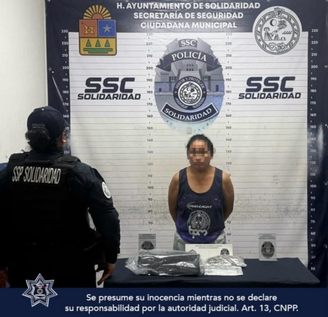 Playa del Carmen, a 16 de marzo de 2025.- La Secretaría de Seguridad Ciudadana Municipal (SSCM) de Solidaridad detuvo a una persona del sexo femenino por la probable comisión de delitos contra la salud en la colonia irregular In House, asegurándole 34 envoltorios de posibles narcóticos.