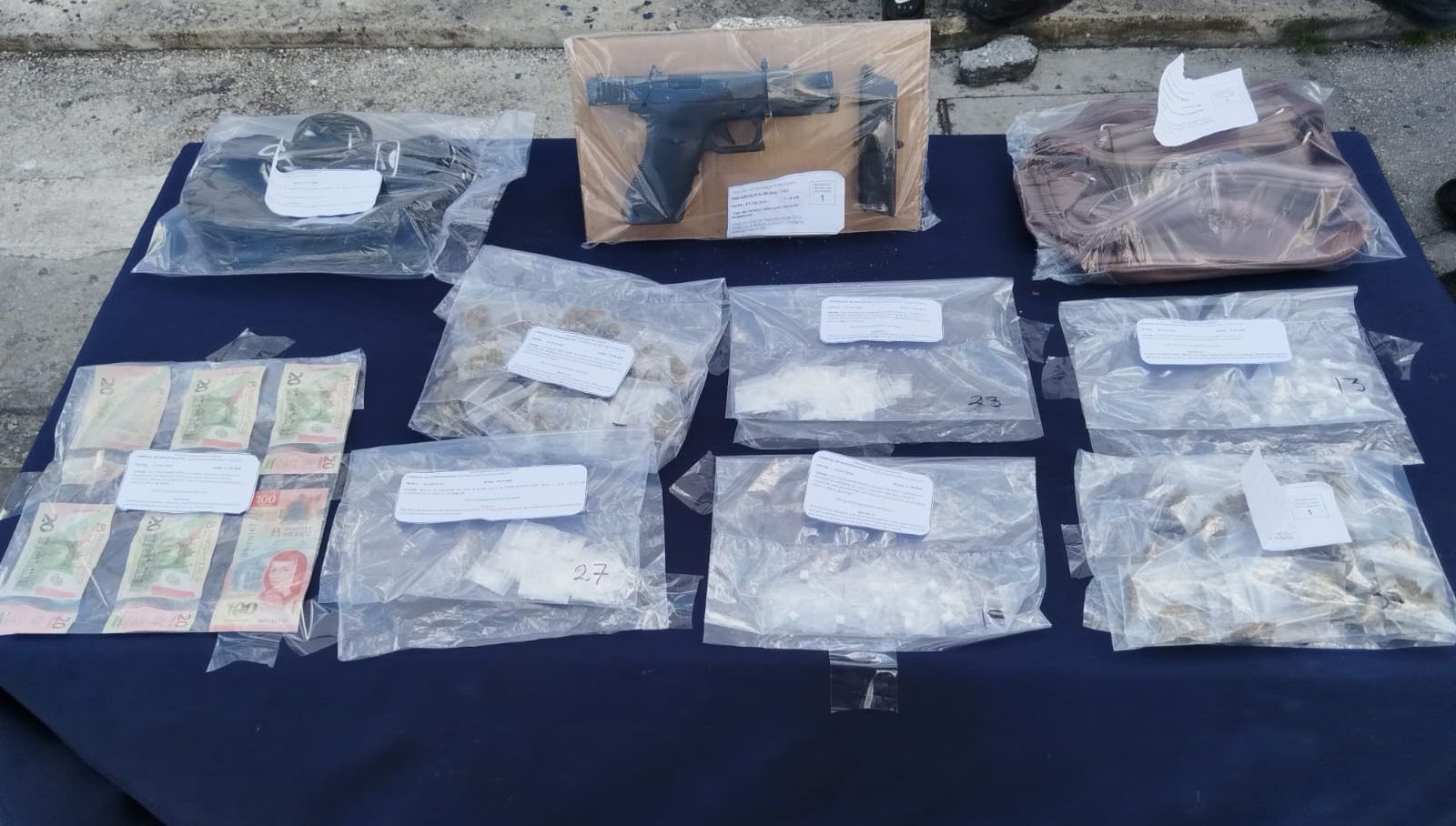 Los artículos confiscados incluyen 72 bolsitas de plástico transparente con hierba seca con características de la marihuana, 27 bolsitas con fragmentos cristalinos similares al alcaloide conocido como cristal y 13 bolsitas con una sustancia sólida parecida a la droga conocida como piedra.