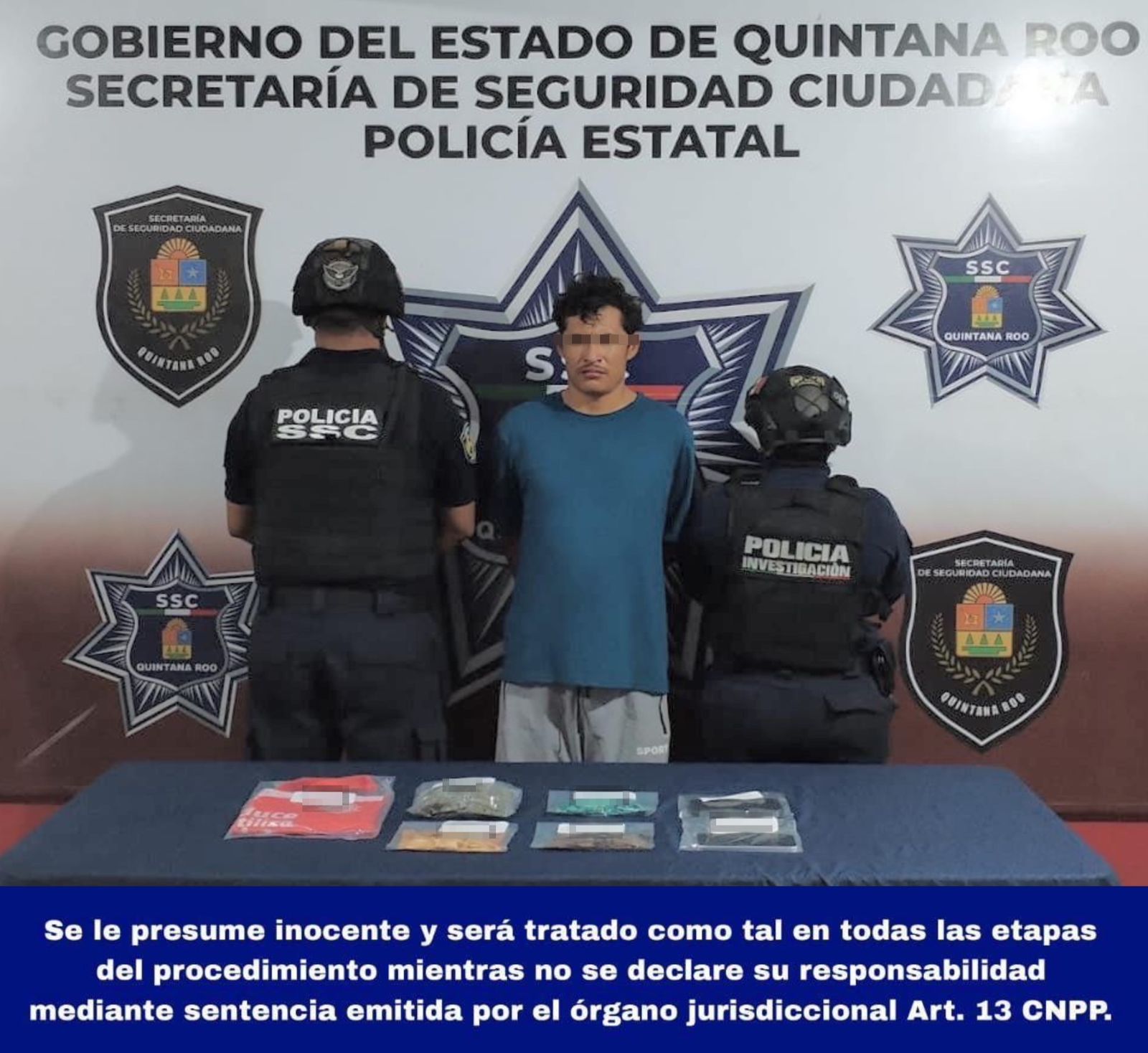Cancún, 4 de mayo. – Elementos de la Secretaría de Seguridad Ciudadana del Estado de Quintana Roo detuvieron a un hombre identificado como Diego “N”, presunto implicado en delitos contra la salud, luego de que accidentalmente dejara al descubierto diversas dosis de droga al dejar caer una bolsa que portaba.