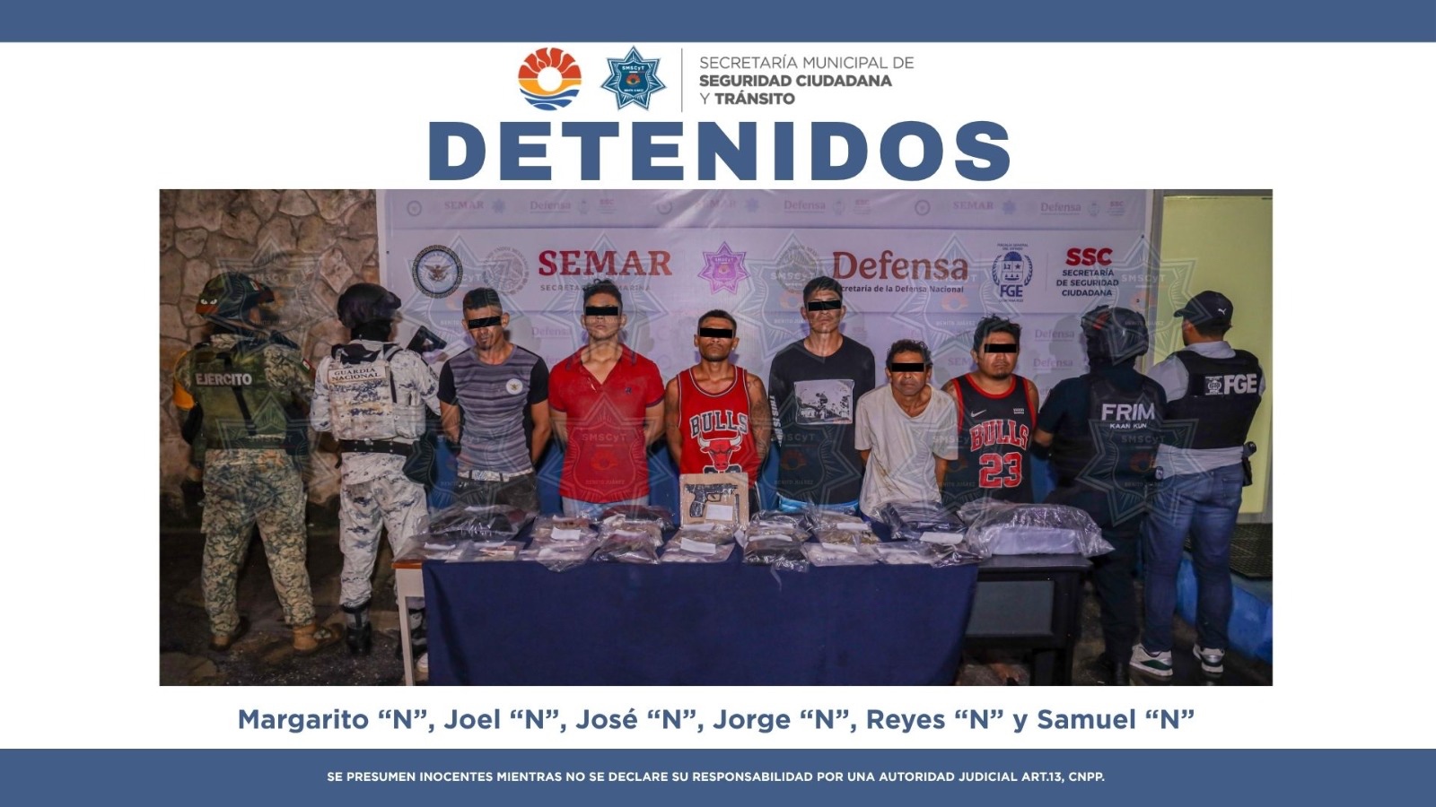 Cancún, 23 de octubre.- La Secretaría Municipal de Seguridad Ciudadana y Tránsito (SMSCyT) de Benito Juárez, en coordinación con la Fiscalía General del Estado (FGE) y fuerzas federales, reportó la detención de un total de ocho hombres en dos operativos distintos, todos por su presunta participación en delitos contra la salud en la modalidad de narcomenudeo.