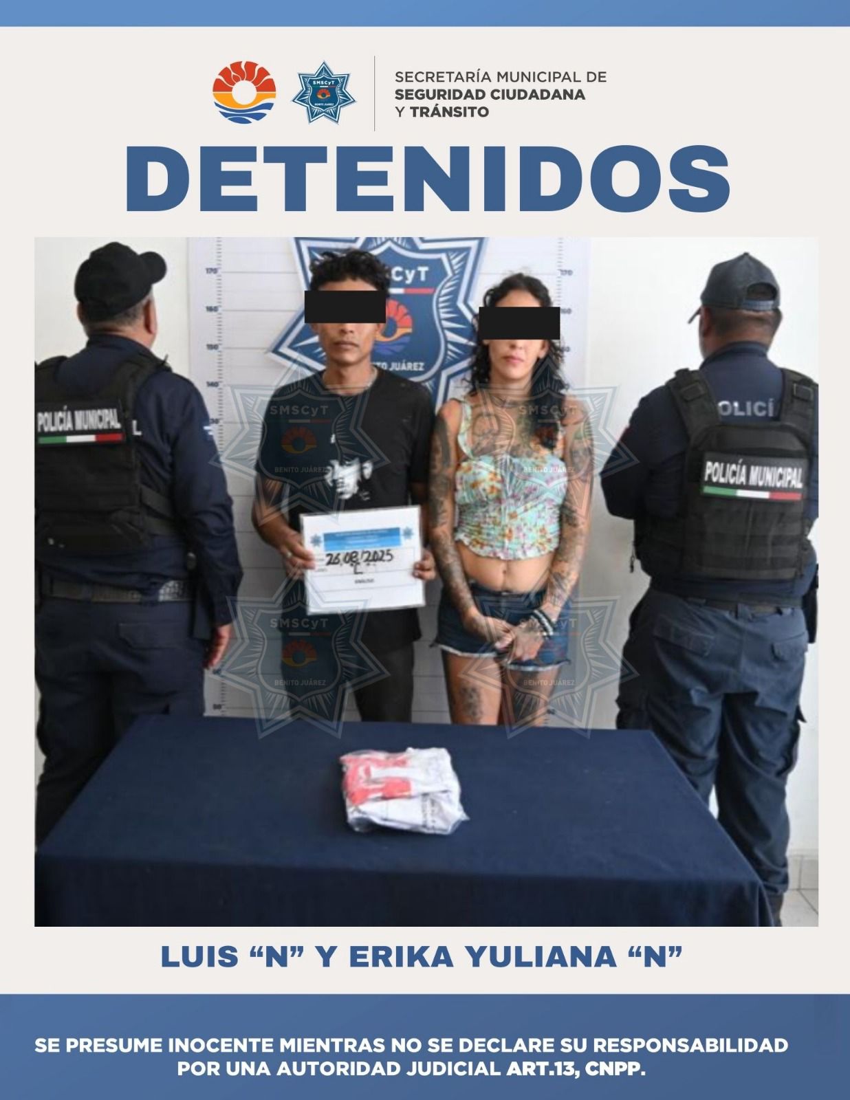 Cancún, 27 de agosto.- Elementos de la Secretaría Municipal de Seguridad Ciudadana y Tránsito (SMSCyT) de Benito Juárez, detuvieron a una pareja señalada por el delito de quebrantamiento de sellos, en hechos ocurridos en la Región 254.