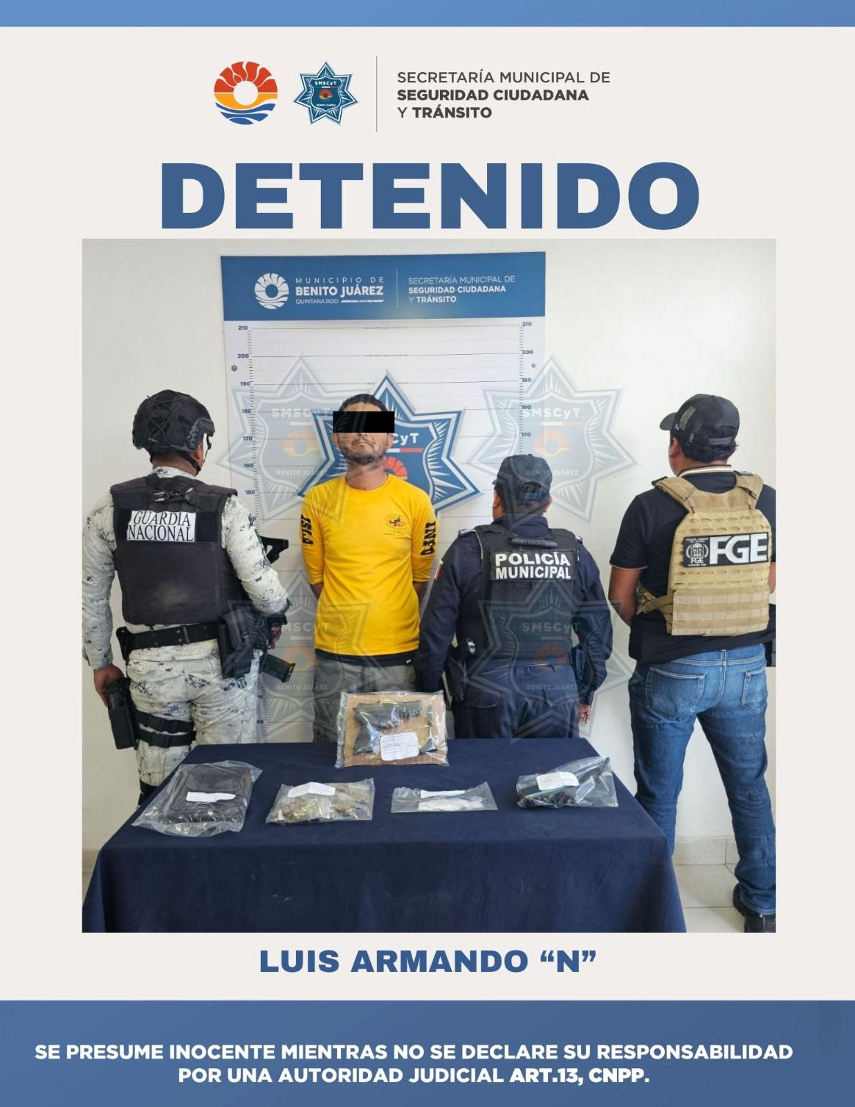 Cancún, 27 de agosto.- Un hombre fue detenido en la Supermanzana 85 de Cancún, por su presunta participación en delitos contra la salud en la modalidad de narcomenudeo, durante un operativo conjunto de la Guardia Nacional, la Fiscalía General del Estado (FGE) y la Secretaría Municipal de Seguridad Ciudadana y Tránsito de Benito Juárez.