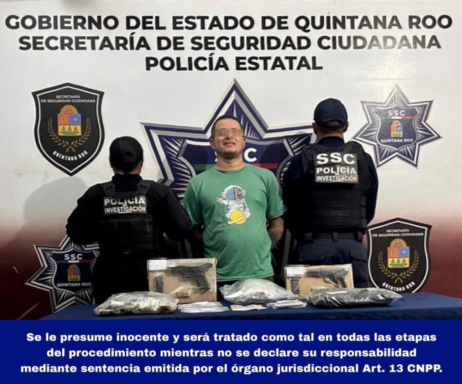 Cancún, 8 de agosto.— Elementos de la Secretaría de Seguridad Ciudadana detuvieron en la supermanzana 253 a un hombre identificado como Jahaziel “N”, acusado de delitos contra la salud y violación a la Ley Federal de Armas de Fuego y Explosivos, tras sorprenderlo con drogas y armamento en el fraccionamiento Galaxia del Sol.