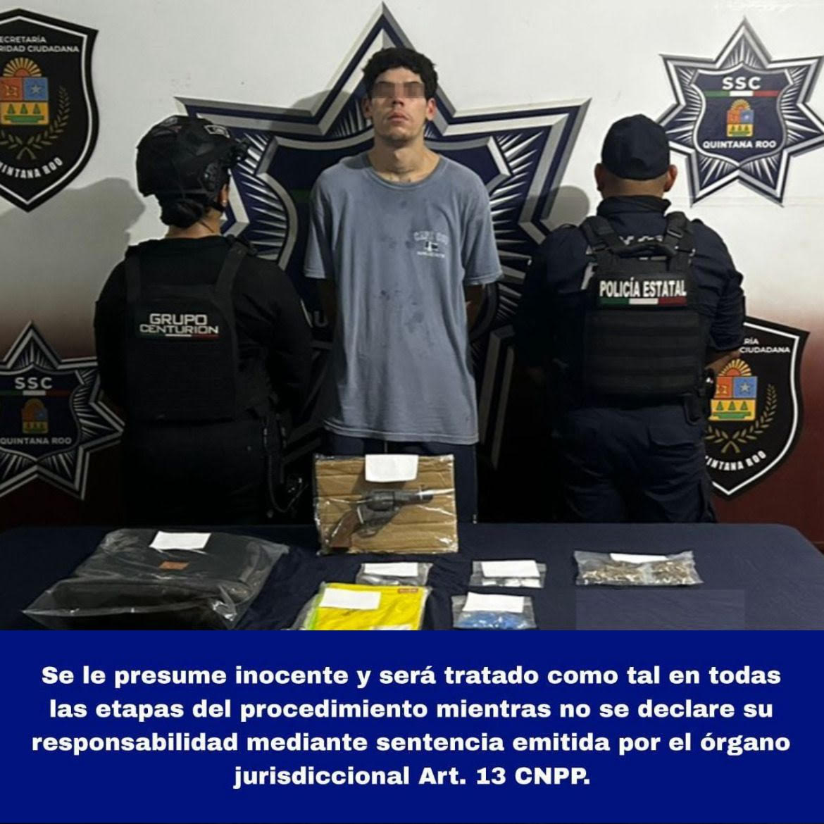 Cancún, 15 de octubre. -Elementos de la Secretaría de Seguridad Ciudadana lograron la detención de un hombre identificado como Leonardo “N”, presuntamente implicado en delitos Contra la Salud y Violación a la Ley Federal de Armas de Fuego y Explosivos, durante un operativo de vigilancia en la colonia Cuna Maya de este municipio.