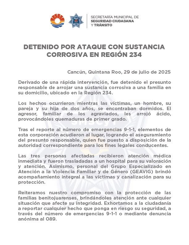 Un hombre fue detenido tras ser señalado como el presunto responsable de arrojar una sustancia corrosiva a una familia en su propio domicilio, ubicado en la Región 234 de Cancún.
