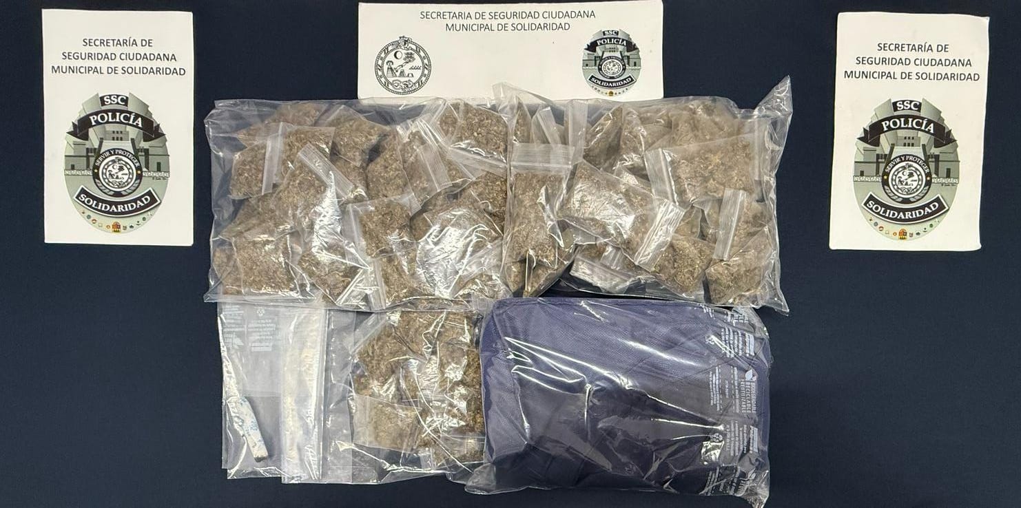 Durante un recorrido de vigilancia, policías municipales observaron a dos individuos que fumaban un cigarrillo con las características propias de la marihuana. Al realizar una inspección, se aseguraron una lonchera térmica con 86 bolsitas con vegetal verde similar a la marihuana, así como otras 10 bolsitas más con la misma sustancia localizadas entre las pertenencias de uno de los detenidos, dando un total de 96 envoltorios, además del cigarrillo.