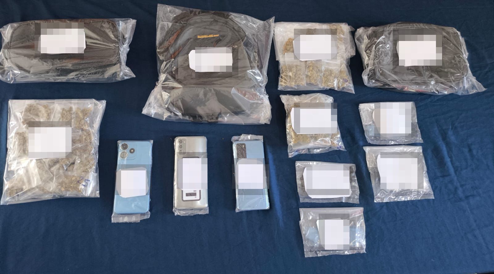 Ante la flagrancia, los uniformados realizaron una revisión en el sitio, asegurando un total de 65 bolsitas con hierba seca con características similares a la marihuana, 27 bolsitas con sustancia cristalina parecida al cristal, y 14 envoltorios translúcidos color azul con material sólido que podría tratarse de la droga conocida como crack.
