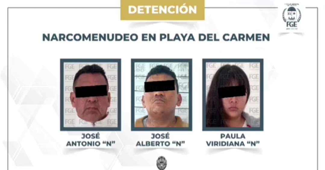 Playa del Carmen, 23 de marzo. – En un operativo conjunto entre la Policía de Investigación de la Fiscalía y la Policía Municipal de Playa del Carmen, se logró la captura de tres personas por su probable participación en delitos contra la salud en la colonia Luis Donaldo Colosio de. Playa del Carmen. Los detenidos fueron identificados como José Antonio N, de 51 años, José Alberto N, de 25 años, y Paula Viridiana N, de 20 años.