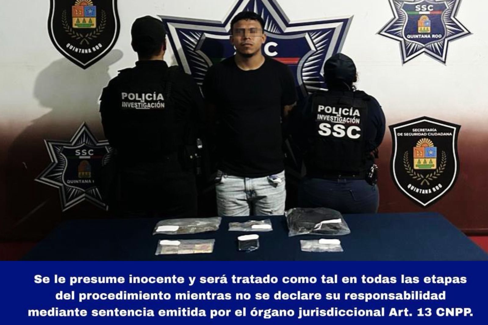En el primer caso, agentes del Grupo de Investigación sorprendieron a Edgar Antonio “N” manipulando bolsitas con presunta droga detrás de un vehículo sobre la avenida Sol, entre avenida Arrecifes y calle Playa Lancheros, en el fraccionamiento Paraíso Maya, Supermanzana 107.