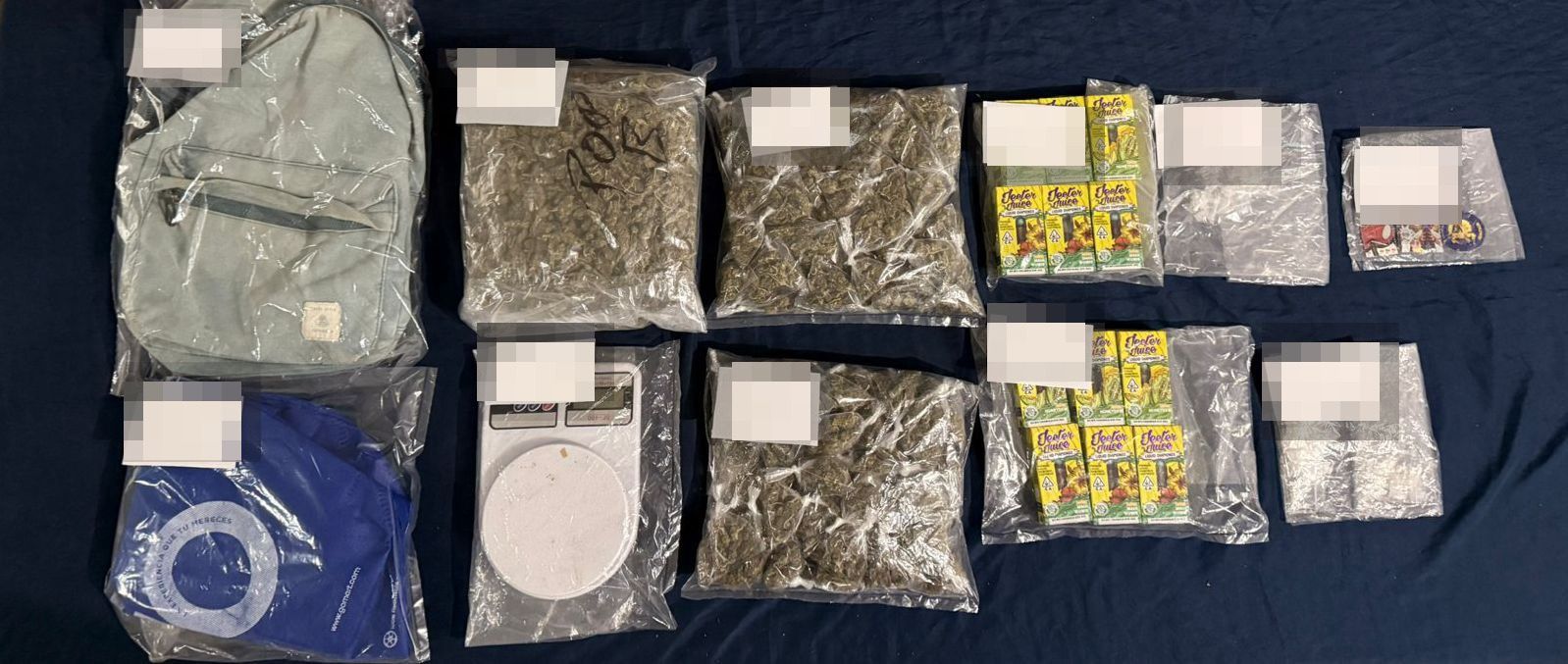 Además, se les aseguraron 12 cajas que contenían cartuchos de vape con líquido de THC, tres láminas con 60 cuadritos y 25 triángulos con imágenes similares a la droga LSD, y una báscula gramera.