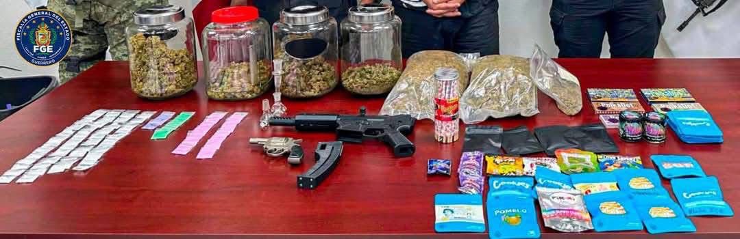 Durante la operación se detuvo a Omar “N”, a quien se le aseguraron dos armas cortas, dinero en efectivo, 31 dosis de posible cocaína, 38 dosis de una sustancia conocida como “tusi”, tres frascos y diez envoltorios con hierba verde seca, con características propias de la marihuana. Además, se encontraron: 8 envoltorios con hongos alucinógenos, 4 paquetes con gomas comestibles que podrían contener THC y/o CBD, 2 frascos y 5 cajas con la droga conocida como “chocohongos”.