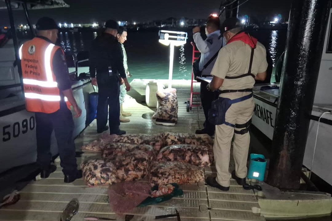 Las autoridades, pasaron inspección a una embarcación menor con cuatro tripulantes a bordo, mismos que trasladaban 359 kilogramos de caracol rosado y cuatro kilogramos de mero (ambas especies en periodo de veda).