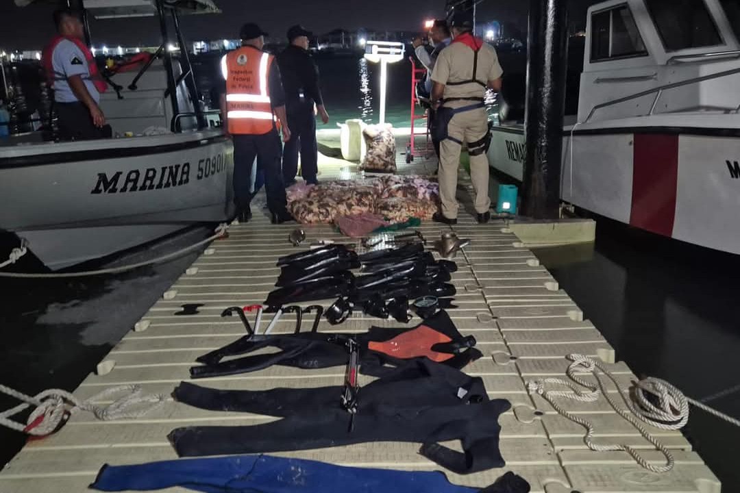 Las autoridades, pasaron inspección a una embarcación menor con cuatro tripulantes a bordo, mismos que trasladaban 359 kilogramos de caracol rosado y cuatro kilogramos de mero (ambas especies en periodo de veda).
