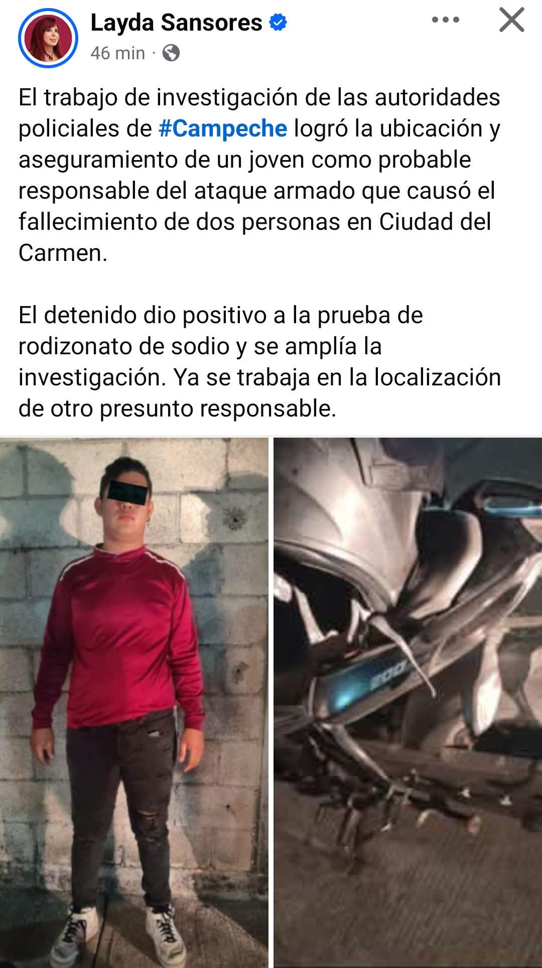 San Francisco de Campeche, Campeche, 22 de enero.- Tras la doble ejecución de un adolescente y un joven, ambos “Motomandaditos”, en Ciudad del Carmen, Campeche, perpetrado el lunes 20 de enero, la mandataria estatal, Layda Elena Sansores San Román, confirmó la noche de este miércoles la detención de uno de los dos implicados en las ejecuciones.