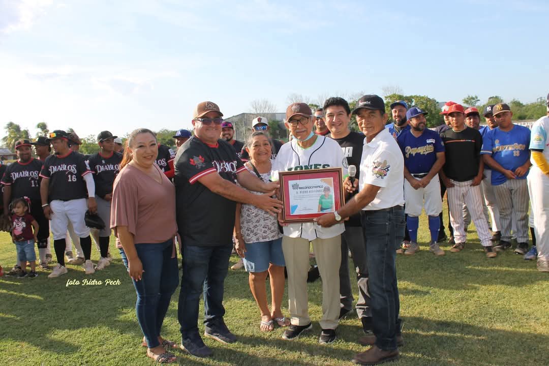 La liga también hizo la entrega de un reconocimiento a Pedro Hernández por su larga trayectoria como anotador y narrador de los juegos que se celebran en el inmueble telchaqueño. Don Pedro estuvo acompañado por su esposa Norma Pacheco y sus hijos Pedro y Leisy Hernández Pacheco.