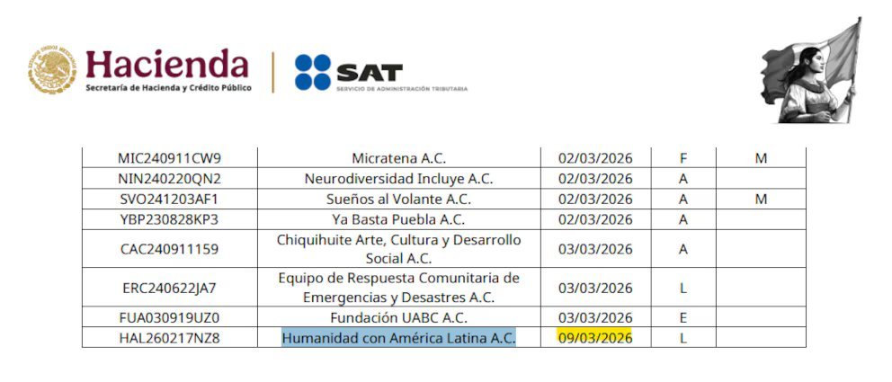 La urgencia del llamado no ha logrado unificar posturas dentro de Morena, mientras el expresidente apela a la “solidaridad histórica”, los registros oficiales del SAT revelan que la asociación beneficiaria, Humanidad con América Latina A.C. (RFC: HAL260217NZ8), obtuvo su estatus de donataria autorizada en un tiempo récord, apareciendo en las listas de Hacienda apenas el pasado 9 de marzo de 2026. Esta celeridad administrativa, que la posiciona como la única organización de su tipo creada y validada en lo que va del año, ha despertado sospechas incluso entre las filas del oficialismo.