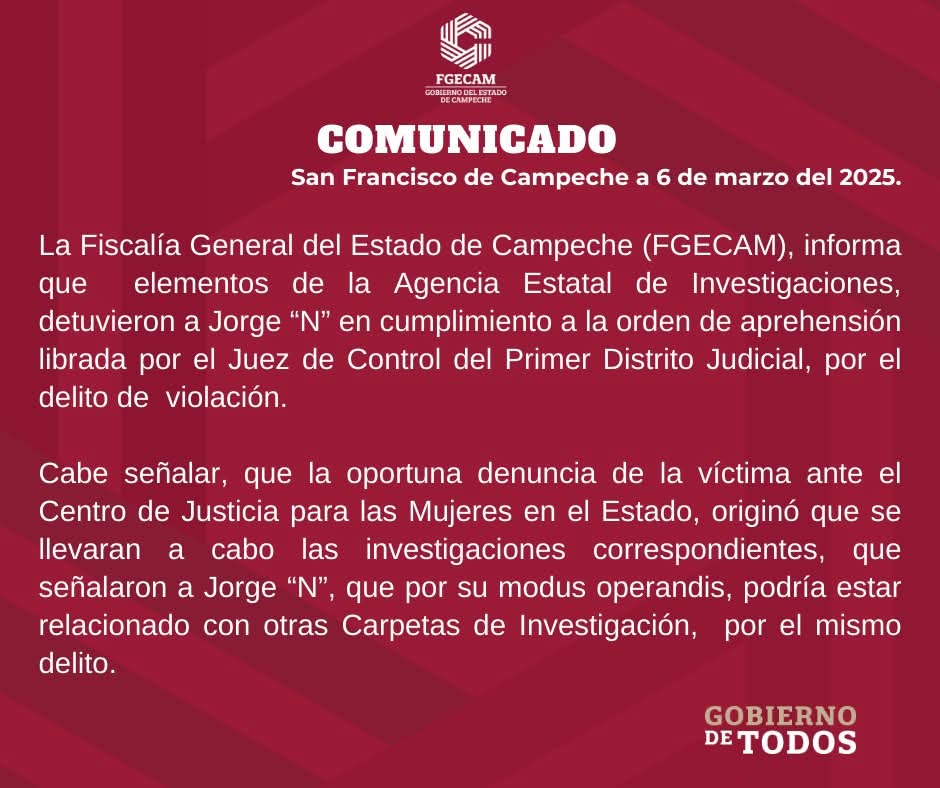Fue la propia FGECAM la que confirmó la detención de Jorge, mediante orden de aprehensión, el jueves 6 de marzo ante las investigaciones por violación y robo.