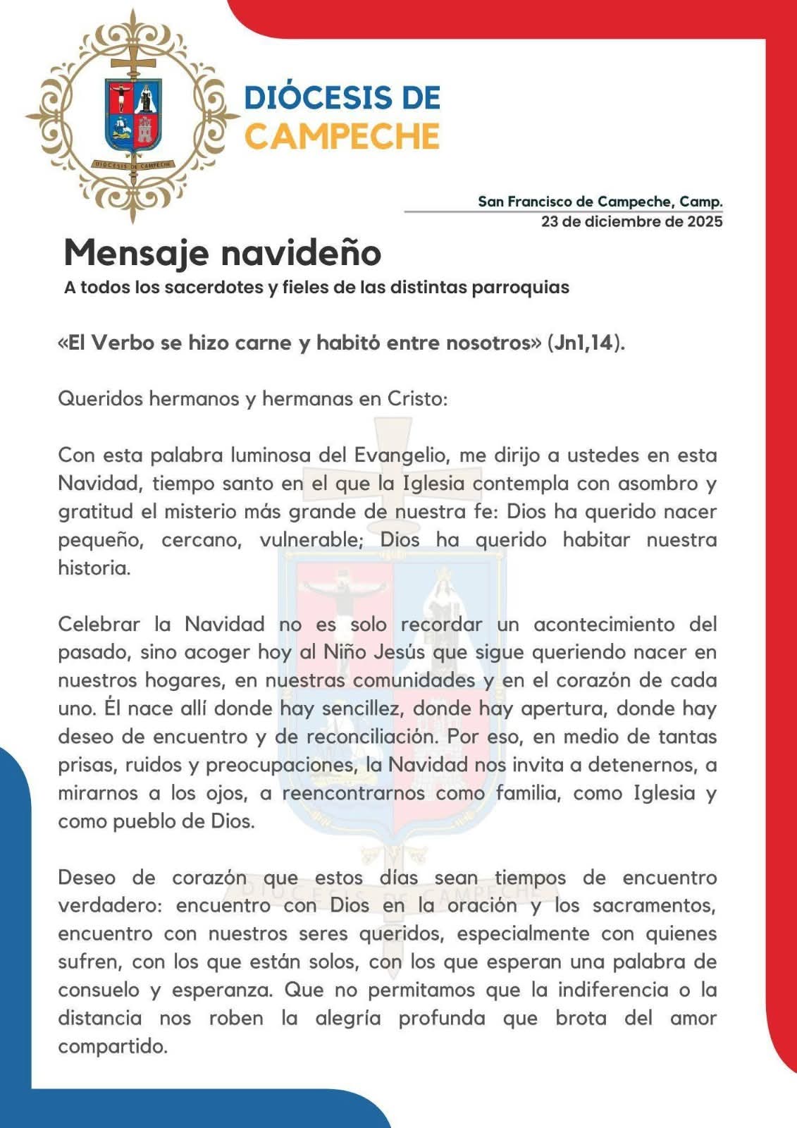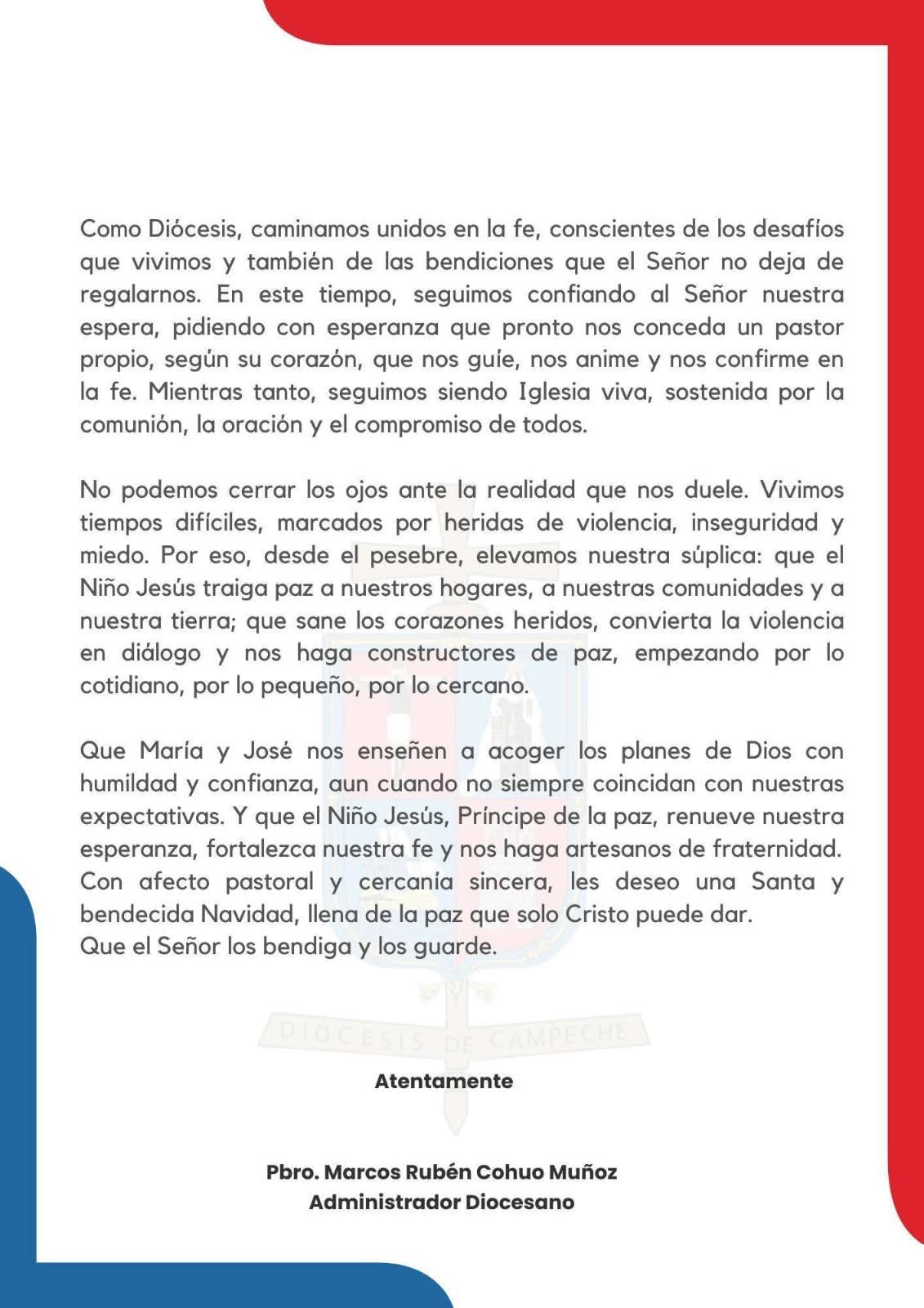 “Como Diócesis, caminamos unidos en la fe, conscientes de los desafíos que vivimos y también de las bendiciones que el Señor no deja de regalarnos”, refiere el mensaje de la Iglesia Católica, rubricado por el Pbro. Marcos Rubén Cohuo Muñoz, Administrador Diocesano.