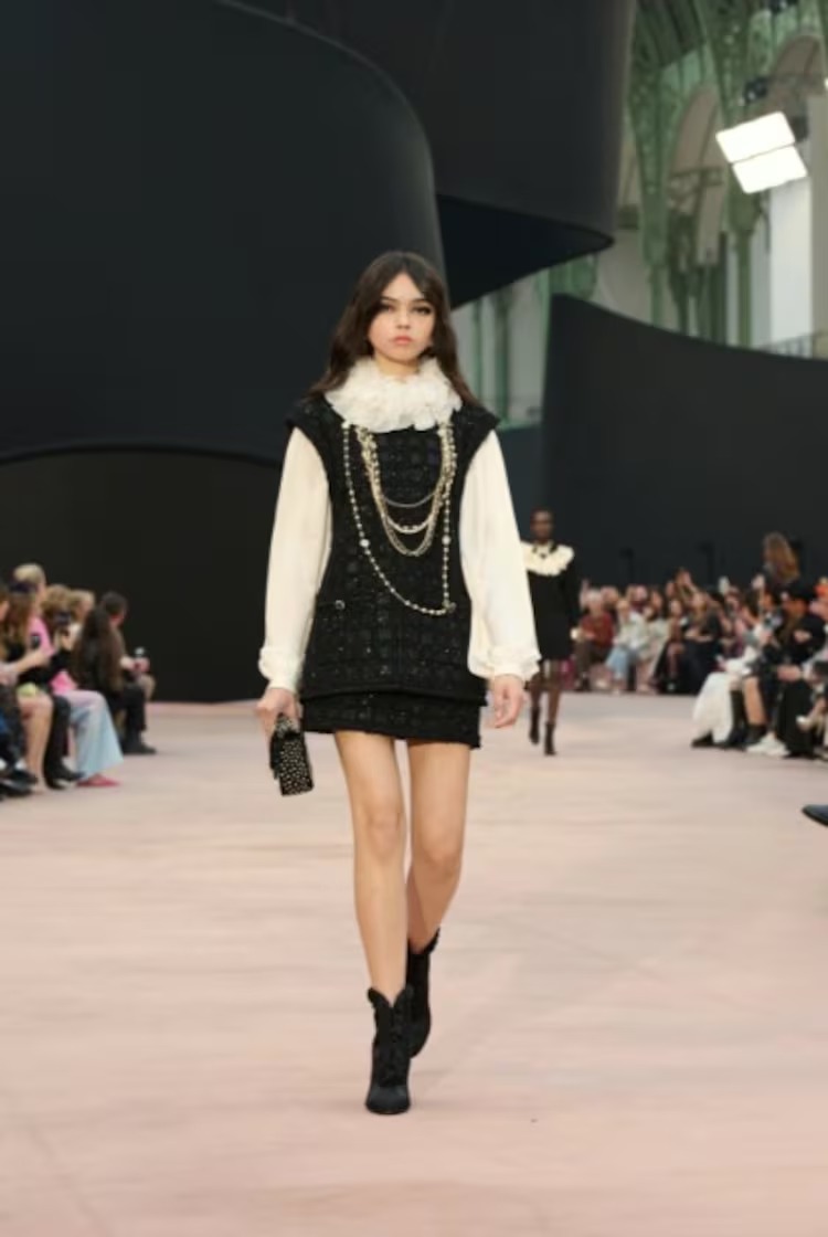 Chanel también dio a conocer en la semana de la moda de París su colección otoño-invierno 2025, en la cual exhibió prendas elegantes y con toques victorianos. Por ejemplo, uno de sus looks se conforma de una blusa blanca con cuello alto saturado de holanes y mangas largas y holgadas.